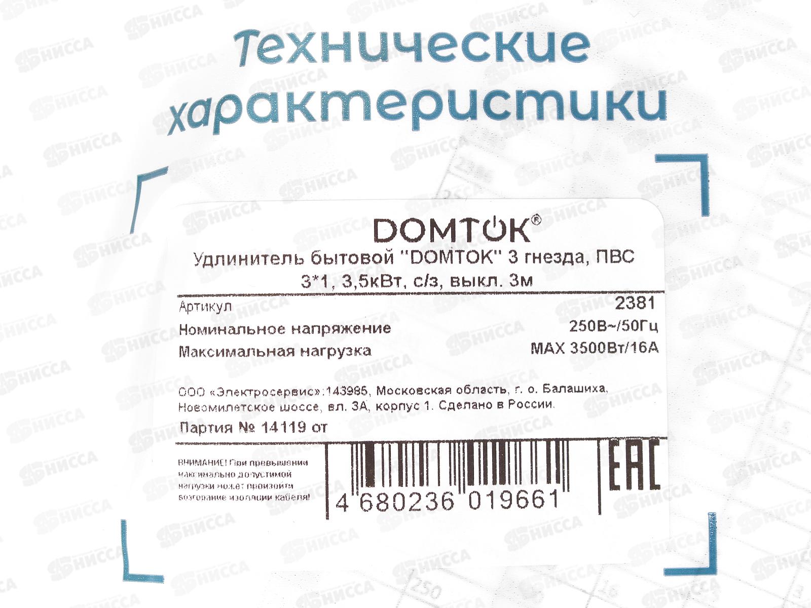 Удлинитель бытовой DOMTOK 3,5кВТ 3гн. ПВС 3*1, с/з,выкл, 3 м, 2381