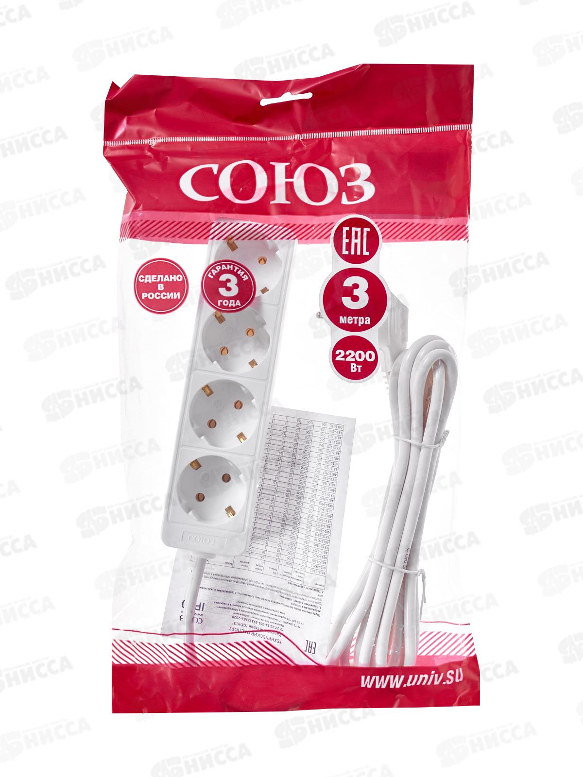 Удлинитель бытово СОЮЗ 2200ВТ 4гн. ПВС , с заземлением, 3м, 481S-9403
