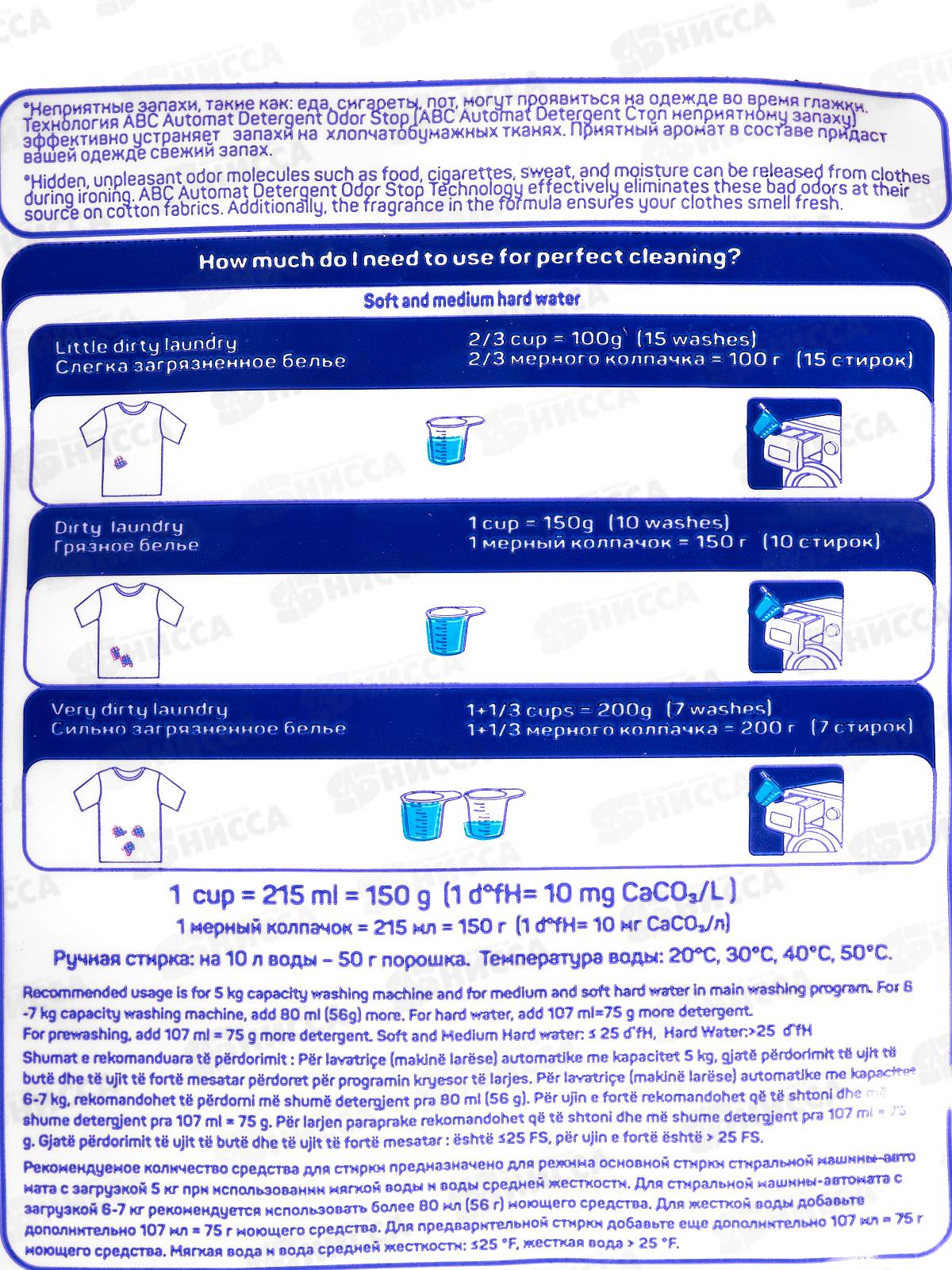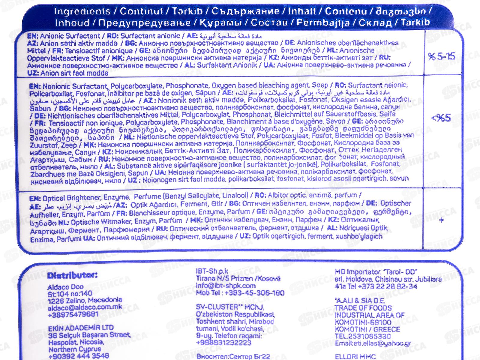 Состав: анионное поверхностно-активное вещество 5-15%, неионное поверхностно-активное вещество, поликарбоксилат, фосфонат, кислородный отбеливатель, мыло, оптический отбеливатель, фермент, отдушка.