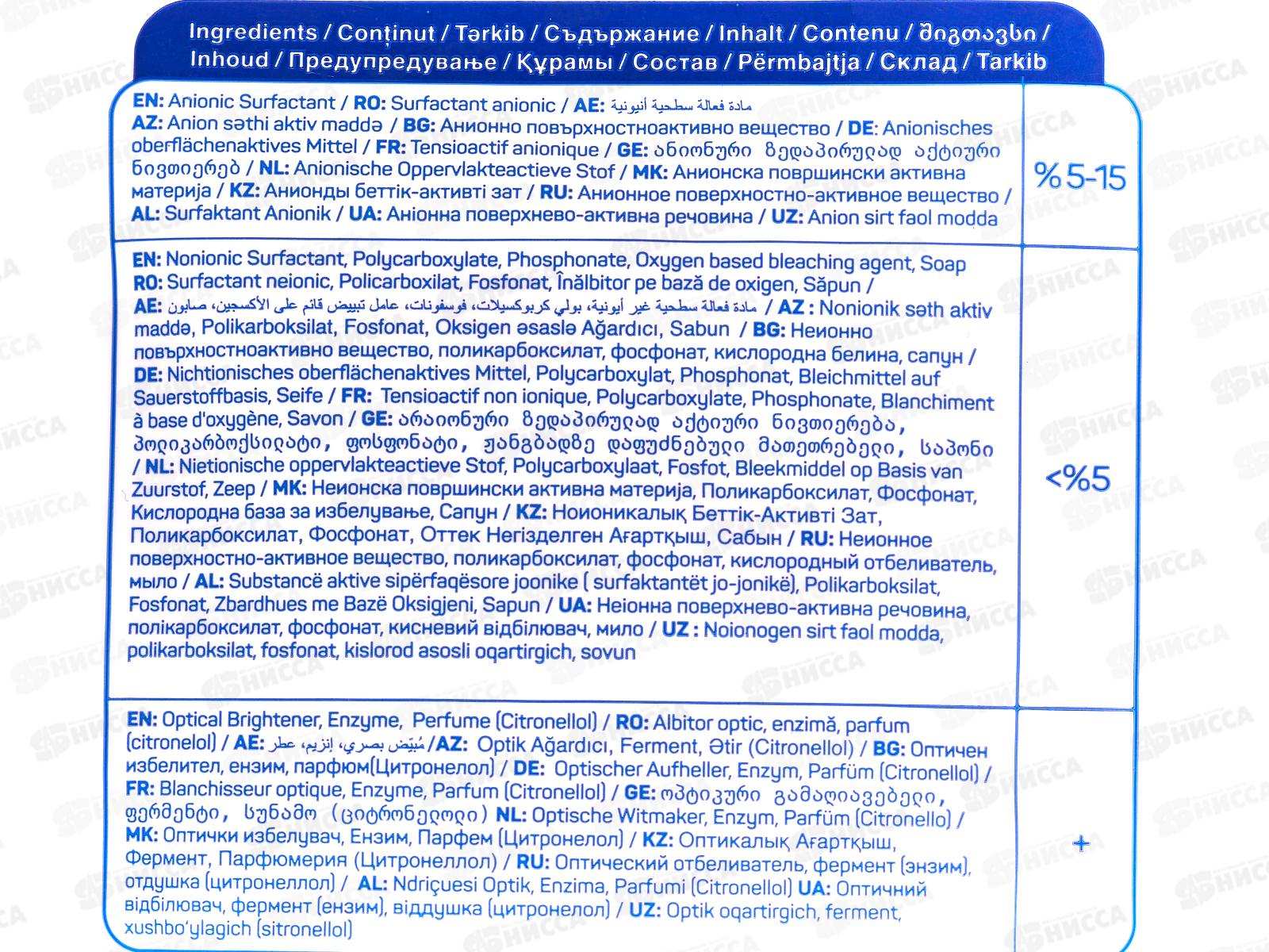 Состав: анионное поверхностно-активное вещество 5-15%, неионное поверхностно-активное вещество, поликарбоксилат, фосфонат, кислородный отбеливатель, мыло, оптический отбеливатель, фермент, отдушка.