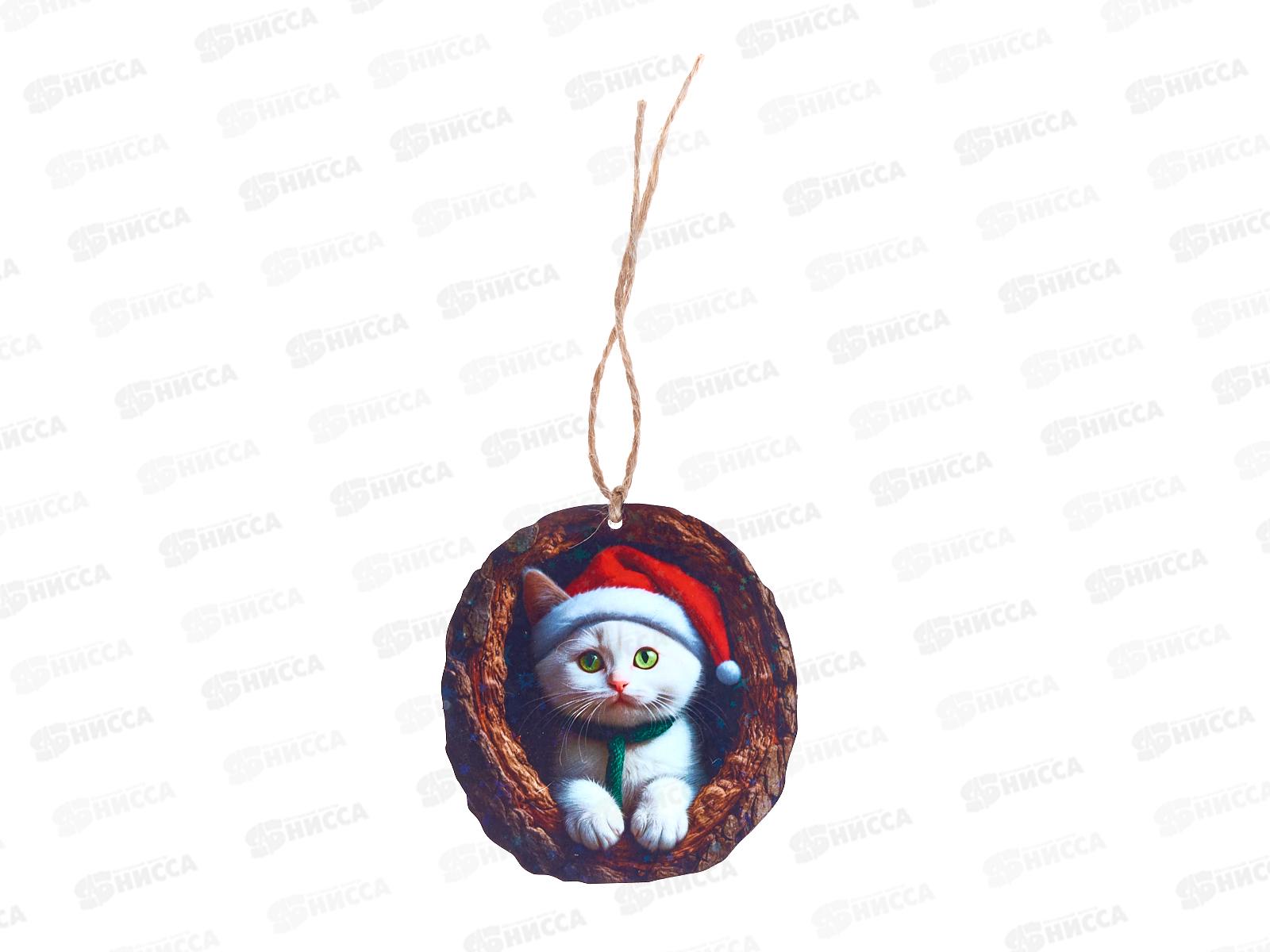 Подвеска на елку дерево нг-ПЦД-012 Белый котик в дупле двусторонняя