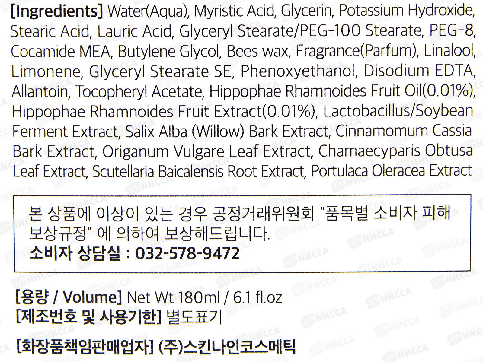Состав: вода, миристиновая кислота, глицерин, гидроксид калия, стеариновая кислота, лауриновая кислота, глицерилстеарат/стеарат ПЭГ?100, ПЭГ?8, кокамид МЕА, бутиленгликоль, пчелиный воск, парфюмерная композиция, линалоол, лимонен, глицерилстеарат SE, феноксиэтанол, динатриевая соль ЭДТА, аллантоин, ацетат токоферила, масло плодов облепихи крушиновидной, экстракт плодов облепихи крушиновидной, ферментированный экстракт сои с лактобактериями, экстракт коры белой ивы, экстракт коры коричника китайского, экстракт листьев душицы обыкновенной, экстракт листьев кипарисовика туполистного, экстракт корня шлемника байкальского, экстракт портулака огородного.