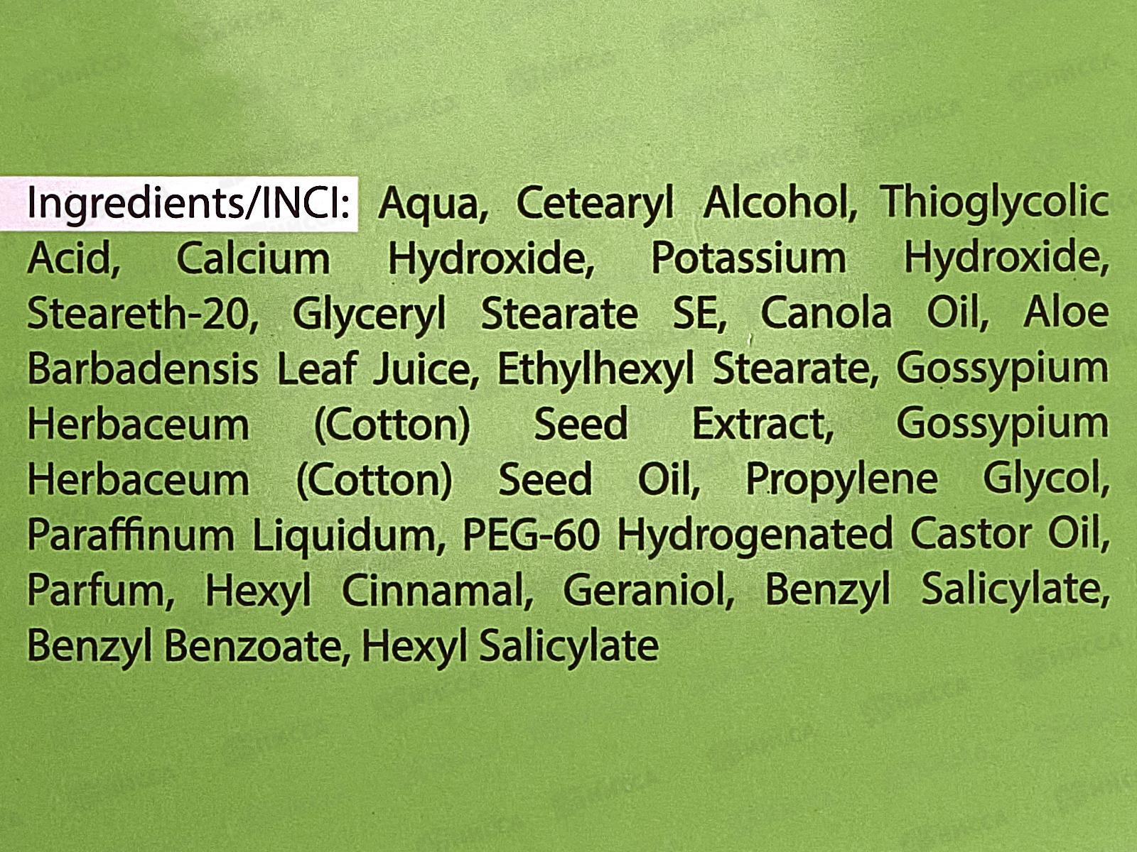 Состав: вода, цетеариловый спирт, тиогликолевая кислота, гидроксид кальция, гидроксид калия, стеарет-20, глицерилстеарат SE, масло канолы, сок листьев алоэ вера, этилгексилстеарат, экстракт семян хлопка (Gossypium herbaceum), масло семян хлопка (Gossypium herbaceum), пропиленгликоль, жидкий парафин, ПЭГ-60 гидрогенизированное касторовое масло, парфюмерная композиция, гексилциннамаль, гераниол, бензилсалицилат, бензилбензоат, гексилсалицилат.