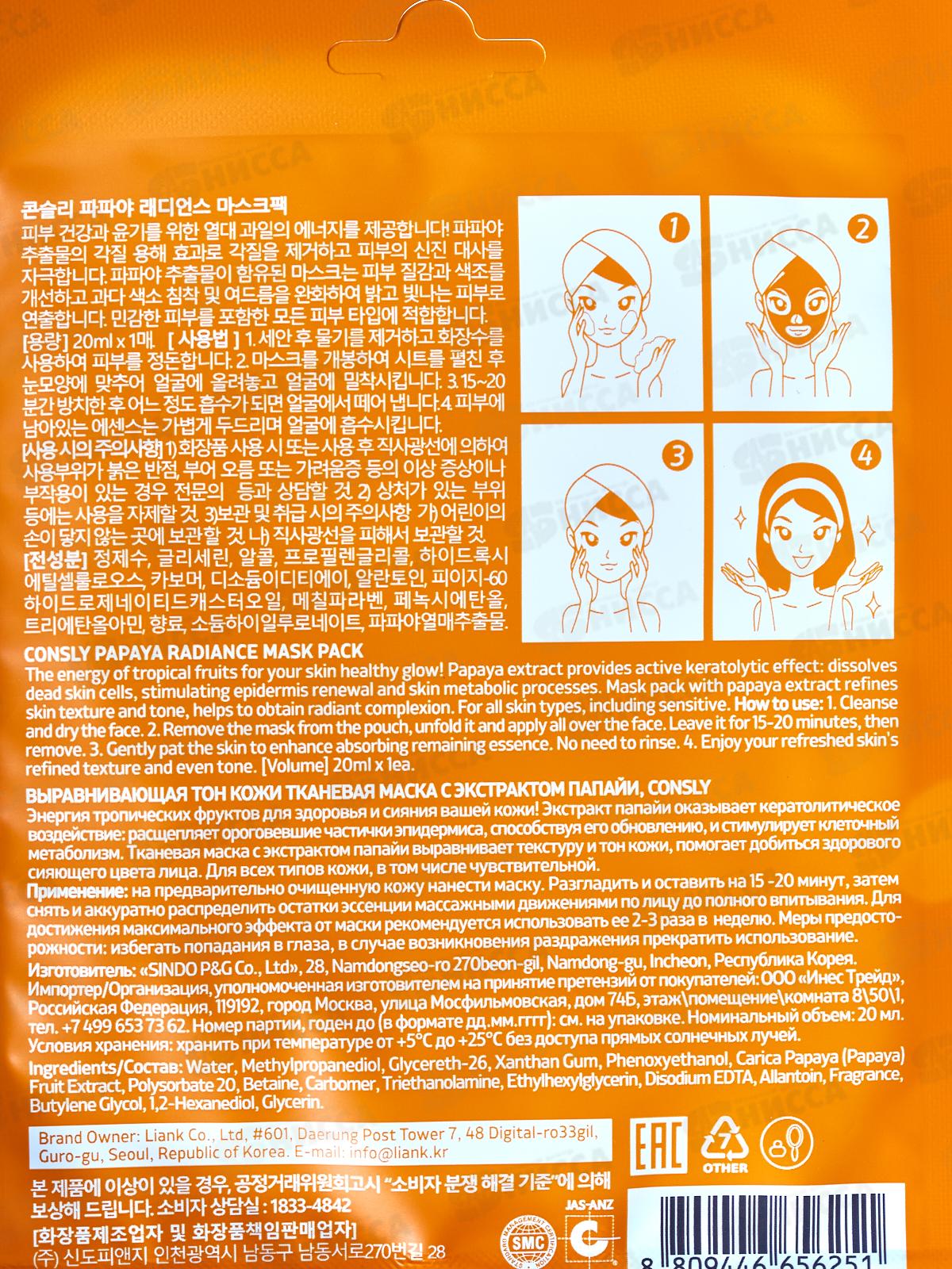 Consly Маска тканевая выравнивающая тон кожи с экстракт папайи 20мл
