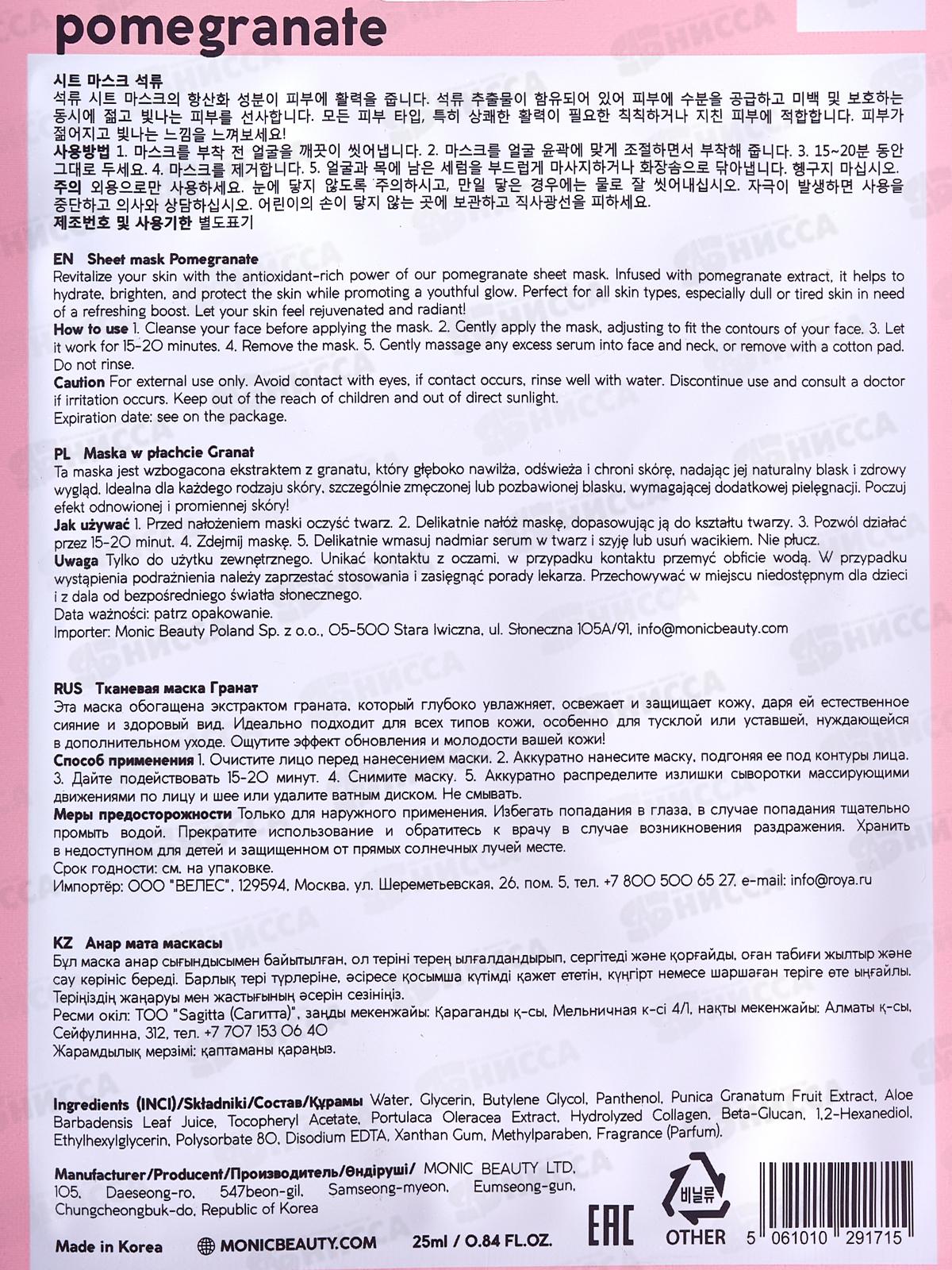 MONIC BEAUTY Тканевая маска для лица Гранат, 24мл (*10)