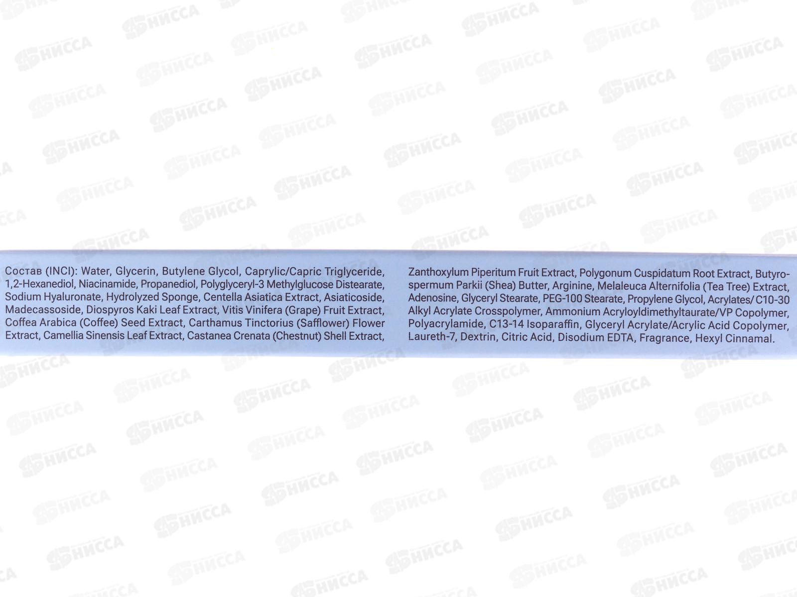 Состав: вода, Глицерин, бутиленгликоль, каприловый/каприновый триглицерид, 1,2-гександиол, ниацинамид, пропандиол, полиглицерил-3 метилглюкозы дистеарат, гиалуронат натрия, гидролизованная губка, экстракт центеллы азиатской, азиатикозид, мадекассозид, экстракт листьев хурмы хурийской, экстракт плодов винограда (Vitis Vinifera), экстракт семян кофе (Coffea Arabica), экстракт цветков сафлора (Carthamus Tinctorius), экстракт листьев зеленого чая (Camellia Sinensis), экстракт скорлупы каштана (Castanea Crenata), экстракт плодов зантоксилума перечного (Zanthoxylum Piperitum), экстракт корня рейнутрии (Polygonum Cuspidatum), масло ши (Butyrospermum Parkii), аргинин, экстракт чайного дерева (Melaleuca Alternifolia), аденозин, бутиленгликоль, 1,2-гександиол, глицерилстеарат, стеарат ПЭГ-100, пропиленгликоль, кроссполимер акрилатов/С10-30 алкилакрилата, сополимер аммония акрилоилдиметилтаурата/ВП, полиакриламид, С13-14 изопарафин, сополимер глицерилакрилата/акриловой кислоты, лаурет-7, декстрин, лимонная кислота, динатриевая соль ЭДТА, отдушка, гексилциннамаль.