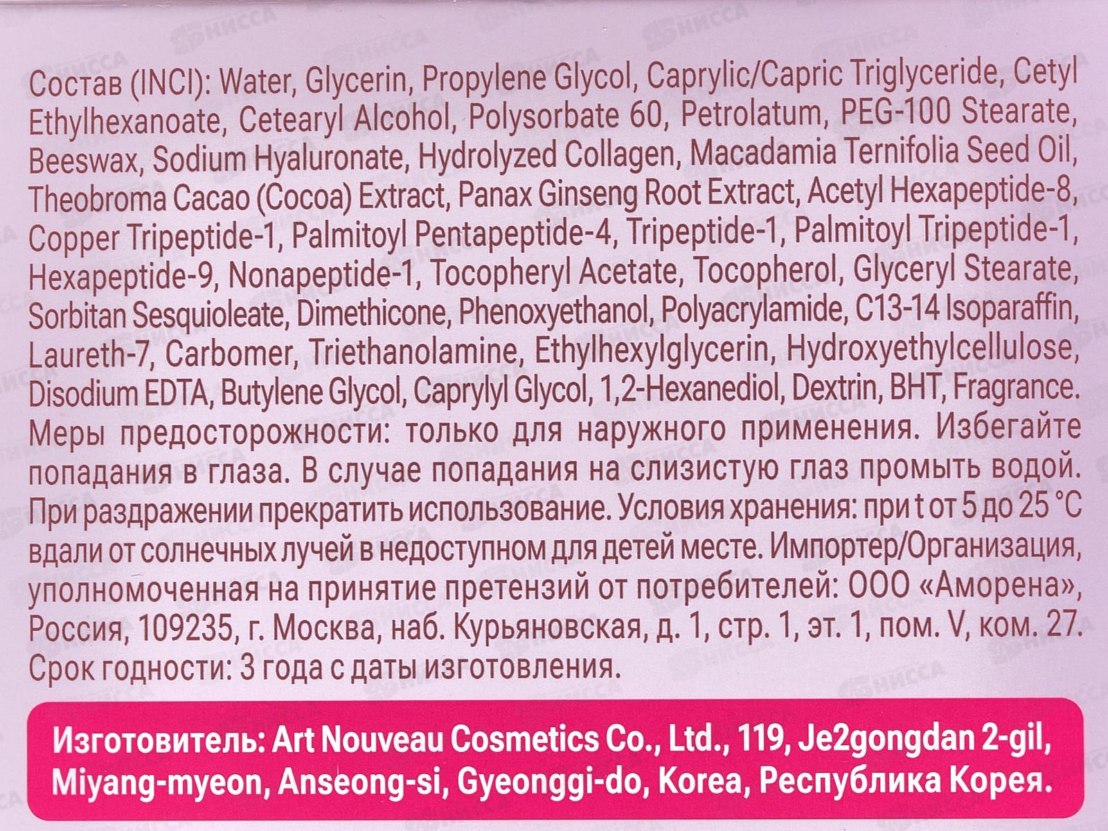 Состав: вода, Глицерин, пропиленгликоль, каприловый/каприновый триглицерид, цетилэтилгексаноат, цетеариловый спирт, полисорбат 60, вазелин, стеарат ПЭГ-100, пчелиный воск, гиалуронат натрия, гидролизованный коллаген, масло семян макадамии Ternifolia, экстракт какао (Theobroma Cacao), экстракт корня женьшеня Panax, ацетилгексапептид-8, трипептид меди-1, пальмитоилпентапептид-4, трипептид-1, пальмитоилтрипептид-1, гексапептид-9, нонапептид-1, токоферилацетат, токоферол, глицерилстеарат, сесквиолеат сорбитана, диметикон, феноксиэтанол, полиакриламид, C13-14 изопарафин, лаурет-7, карбомер, триэтаноламин, Этилгексилглицерин, гидроксиэтилцеллюлоза, динатриевая соль ЭДТА, бутиленгликоль, каприлилгликоль, 1,2-гександиол, декстрин, бутилгидрокситолуол, отдушка.