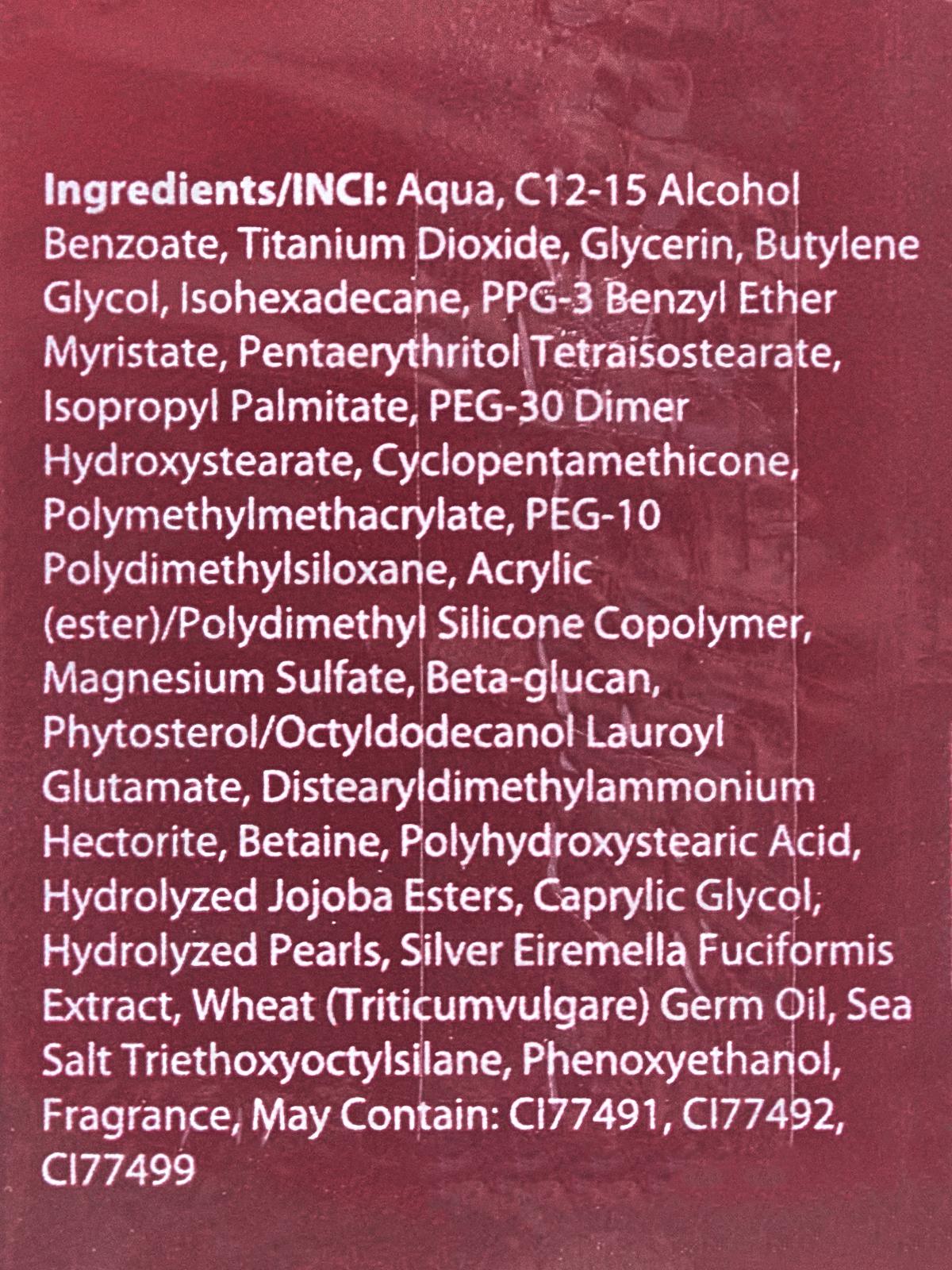 Состав: Тальк, слюда, нитрид бора, диоксид кремния, диметикон, диизостеарил малат, фенилтриметикон, пентаэритритил тетраэтилгексаноат, гидрогенизированный полидецен, синтетический флуорфлогопит, триэтоксикаприлилсилан, гидроксиапатит, феноксиэтанол, этилгексилглицерин, оксид цинка, гидроксид алюминия, токоферол. Может содержать: CI?77891, CI?77492, CI?77742, CI?77491, CI?77499.