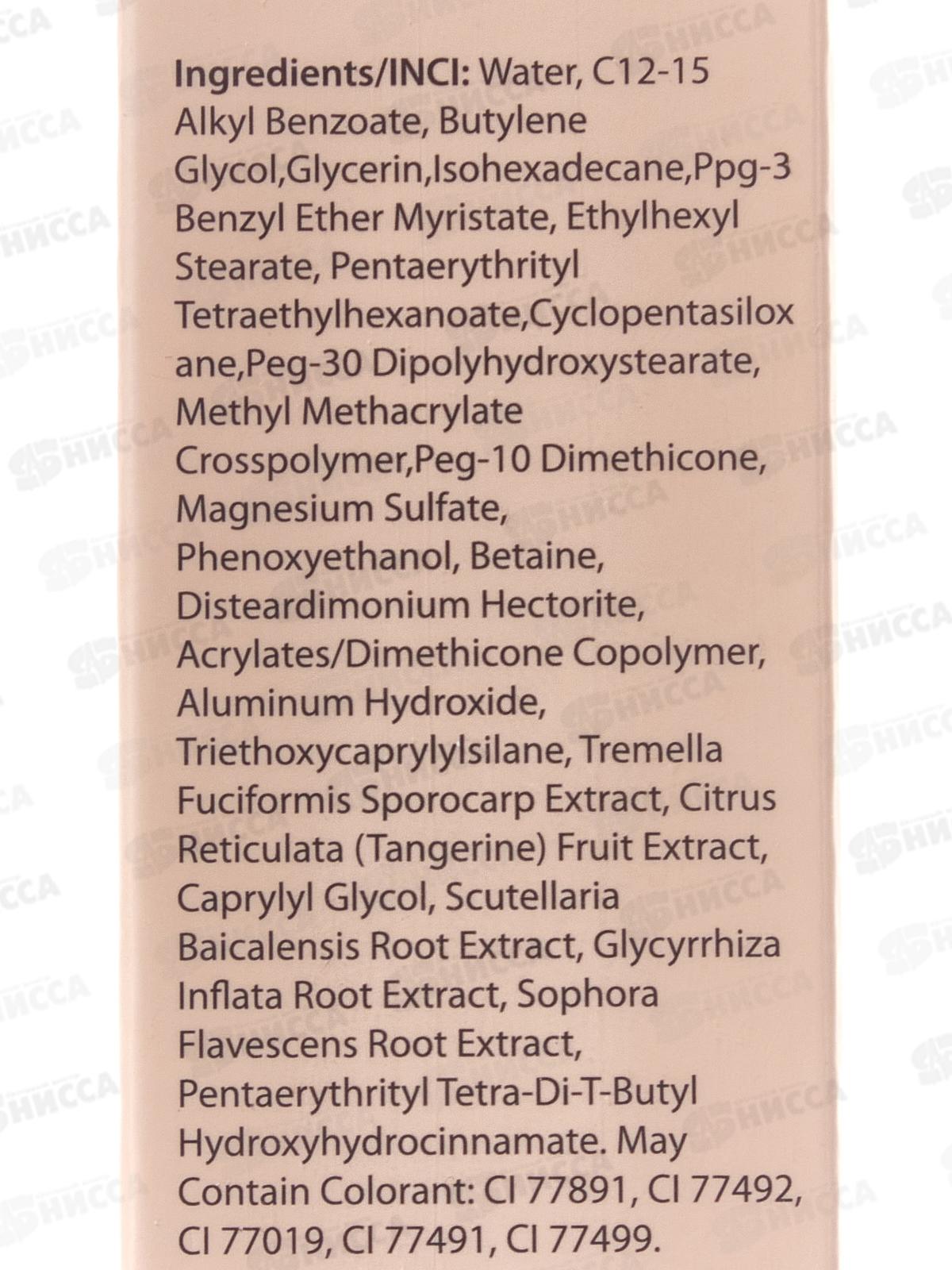 Состав: Вода, C12-15 алкилбензоат, бутиленгликоль, глицерин, изогексадекан, PPG-3 бензилэфир миристат, этилгексилстеарат, пентаэритритил тетраэтилгексаноат, циклопентасилоксан, PEG-30 диполигидроксистеарат, метилметакрилатный кроссполимер, PEG-10 диметикон, сульфат магния, феноксиэтанол, бетаин, дистеардимониум гекторит, сополимер акрилатов/диметикона, гидроксид алюминия, триэтоксикаприлсилан, экстракт спорокарпа тремеллы фуциформной, экстракт плодов мандарина (Citrus reticulata), каприлилгликоль, экстракт корня шлемника байкальского, экстракт корня солодки вздутой, экстракт корня софоры желтоватой, пентаэритритил тетра-ди-трет-бутилгидроксигидроциннамат. Может содержать красители: диоксид титана (CI 77891), оксид железа жёлтый (CI 77492), слюда (CI 77019), оксид железа красный (CI 77491), оксид железа чёрный (CI 77499).
