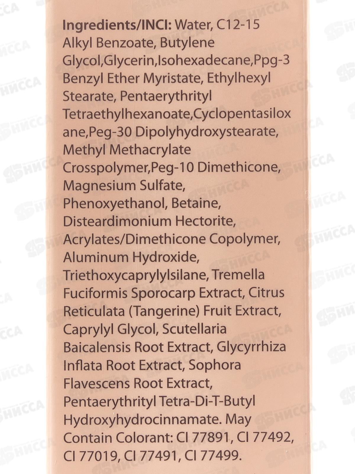 Состав: Вода, C12-15 алкилбензоат, бутиленгликоль, глицерин, изогексадекан, PPG-3 бензилэфир миристат, этилгексилстеарат, пентаэритритил тетраэтилгексаноат, циклопентасилоксан, PEG-30 диполигидроксистеарат, метилметакрилатный кроссполимер, PEG-10 диметикон, сульфат магния, феноксиэтанол, бетаин, дистеардимониум гекторит, сополимер акрилатов/диметикона, гидроксид алюминия, триэтоксикаприлсилан, экстракт спорокарпа тремеллы фуциформной, экстракт плодов мандарина (Citrus reticulata), каприлилгликоль, экстракт корня шлемника байкальского, экстракт корня солодки вздутой, экстракт корня софоры желтоватой, пентаэритритил тетра-ди-трет-бутилгидроксигидроциннамат. Может содержать красители: диоксид титана (CI 77891), оксид железа жёлтый (CI 77492), слюда (CI 77019), оксид железа красный (CI 77491), оксид железа чёрный (CI 77499).
