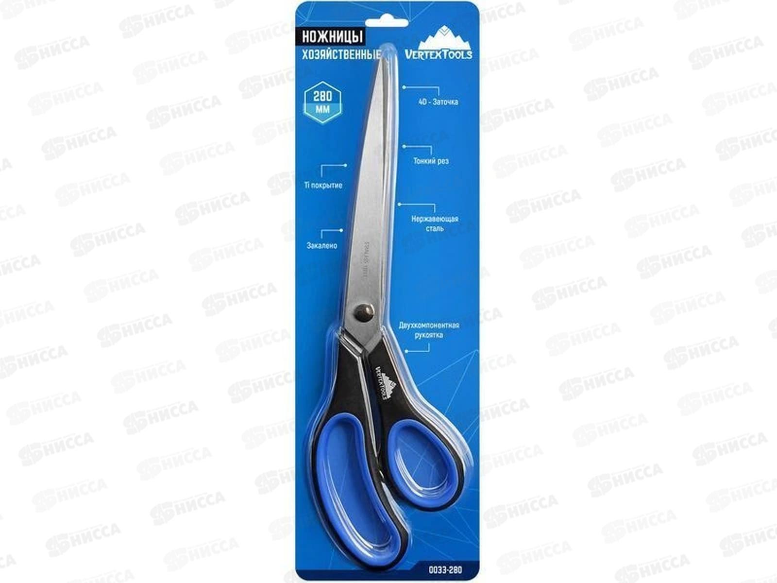 Ножницы хозяйственные 280 мм двухкомпонентные ручки VertexTools - универсальный ручной инструмент, применяемый для резки картона, тканей, бумаги.Ножницы оснащены 4D-лезвиями с дугообразной геометрией режущей кромки, широким углом схождения концов, многопрофильной заточкой и вогнутой внутренней поверхностью.