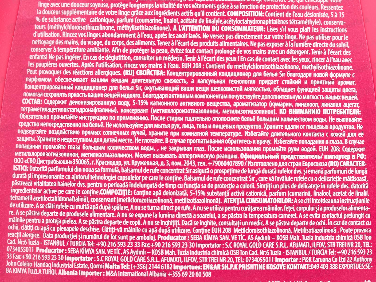 СИР Кондиционер для белья аромат роза и пион розовый цвет 1440мл *9