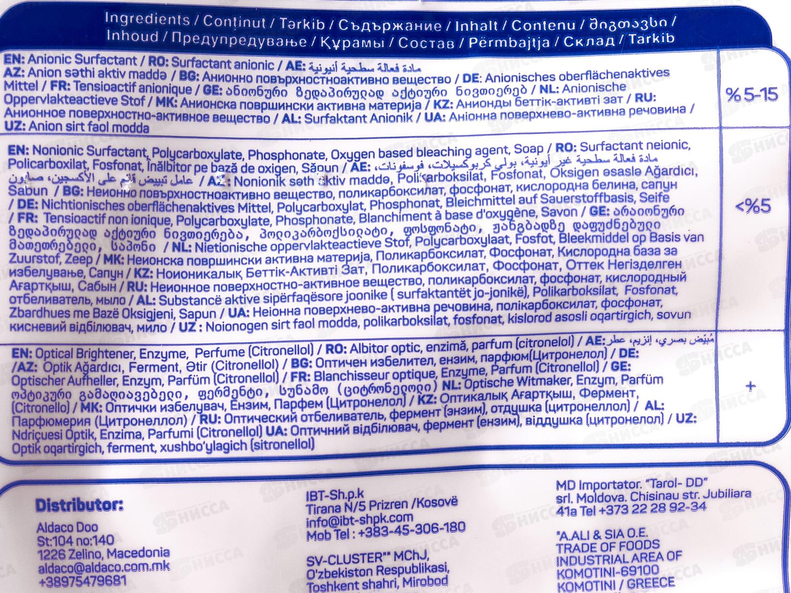 Состав: анионное поверхностно-активное вещество 5-15%, неионное поверхностно-активное вещество, поликарбоксилат, фосфонат, кислородный отбеливатель, мыло, оптический отбеливатель, фермент, отдушка.