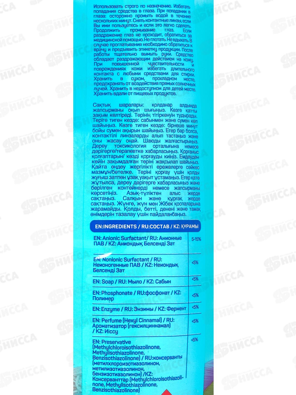 Состав: анионные ПАВ 5-15%, неиногенные ПАВ 5%, мыло 5%, полимер 5%, фермент 5%, ароматизатор 5%, консерванты (метилхлороизотиазолинон, метилизотиазолинон, бензизотиазолинон) 5%.