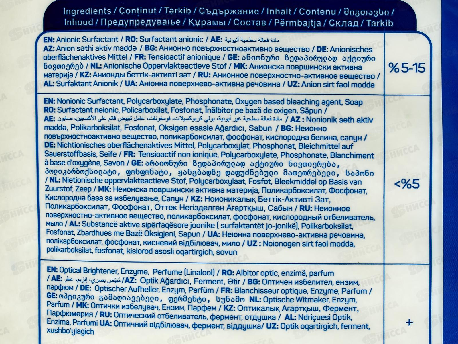 Состав: анионное поверхностно-активное вещество 5-15%, неионное поверхностно-активное вещество, поликарбоксилат, фосфонат, кислородный отбеливатель, мыло, оптический отбеливатель, фермент (энзим), отдушка.