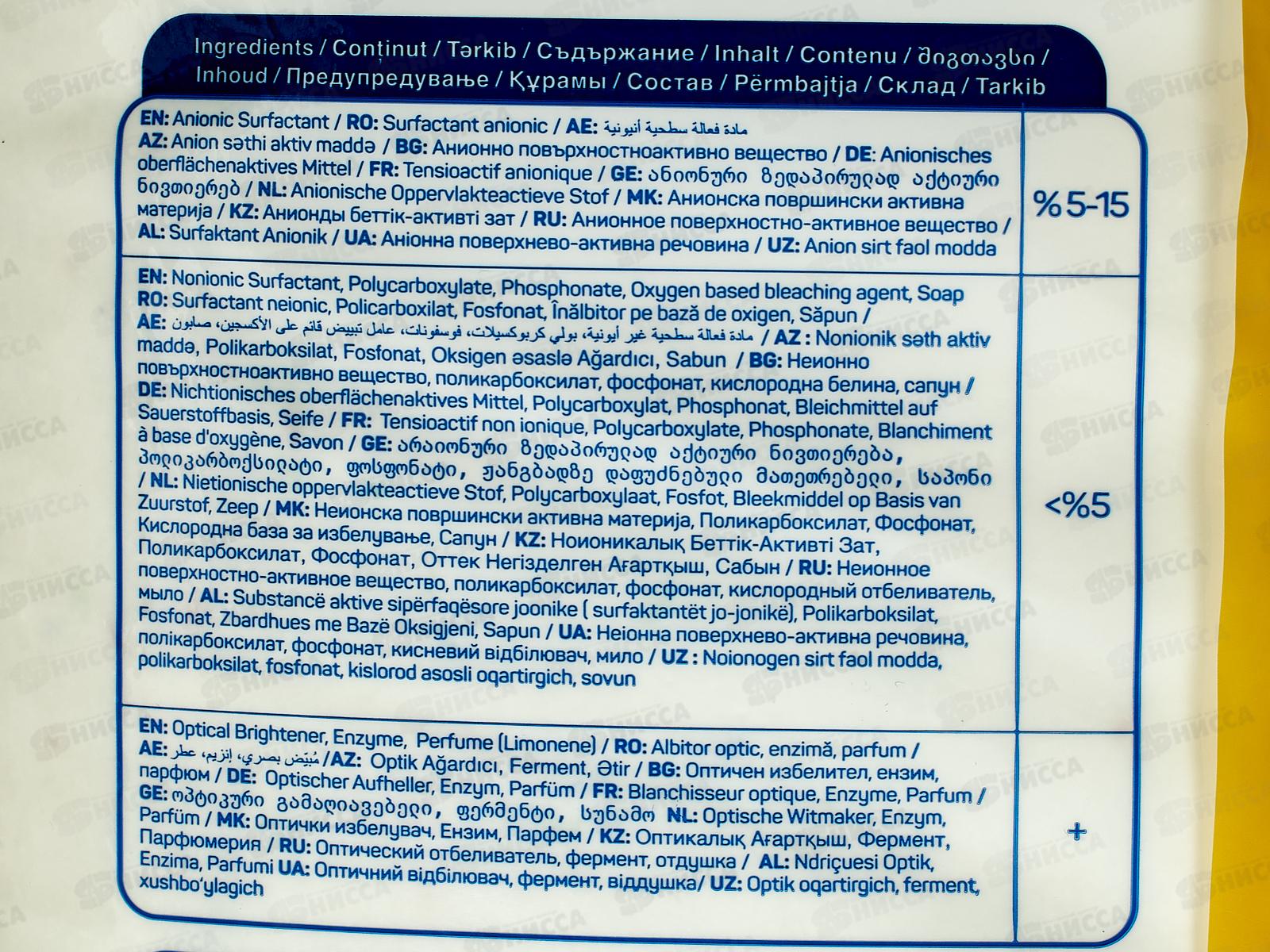 Состав: анионное поверхностно-активное вещество 5-15%, неионное поверхностно-активное вещество, поликарбоксилат, фосфонат, кислородный отбеливатель, мыло, оптический отбеливатель, фермент, отдушка.