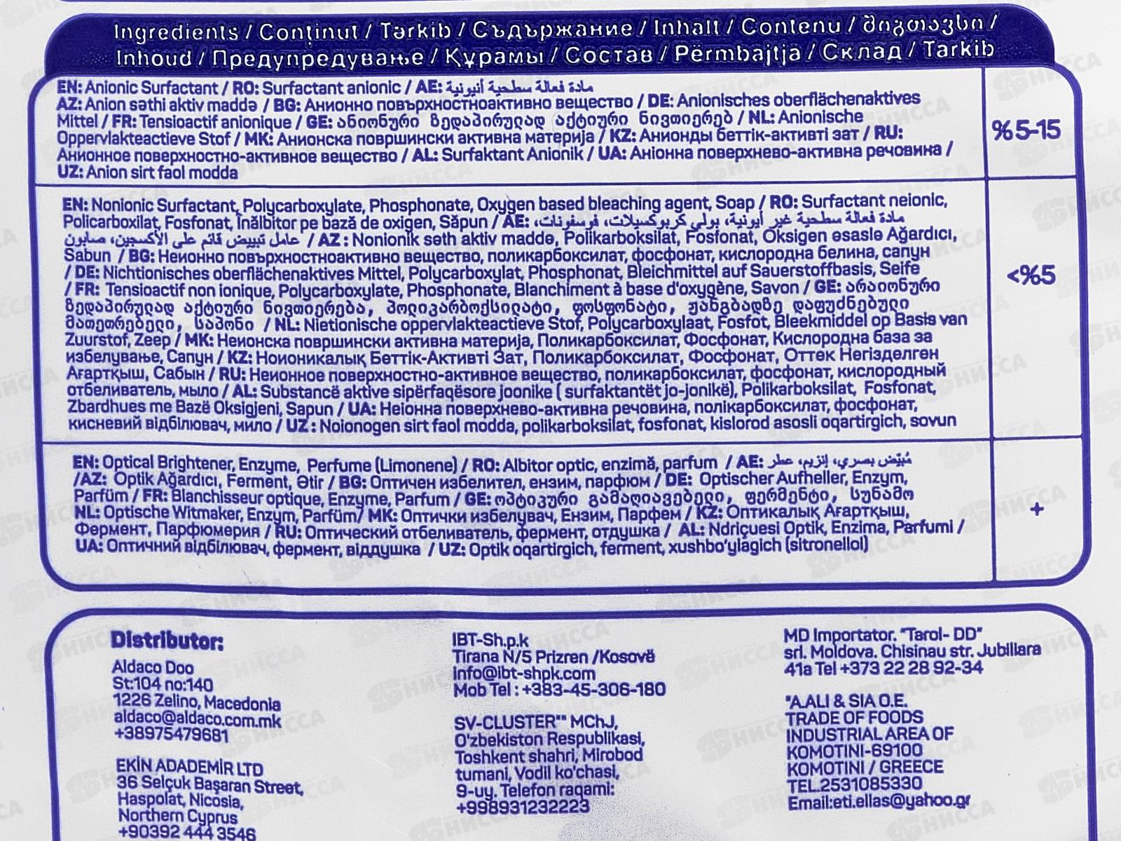 Состав: анионное поверхностно-активное вещество 5-15%, неионное поверхностно-активное вещество, поликарбоксилат, фосфонат, кислородный отбеливатель, мыло, оптический отбеливатель, фермент, отдушка.