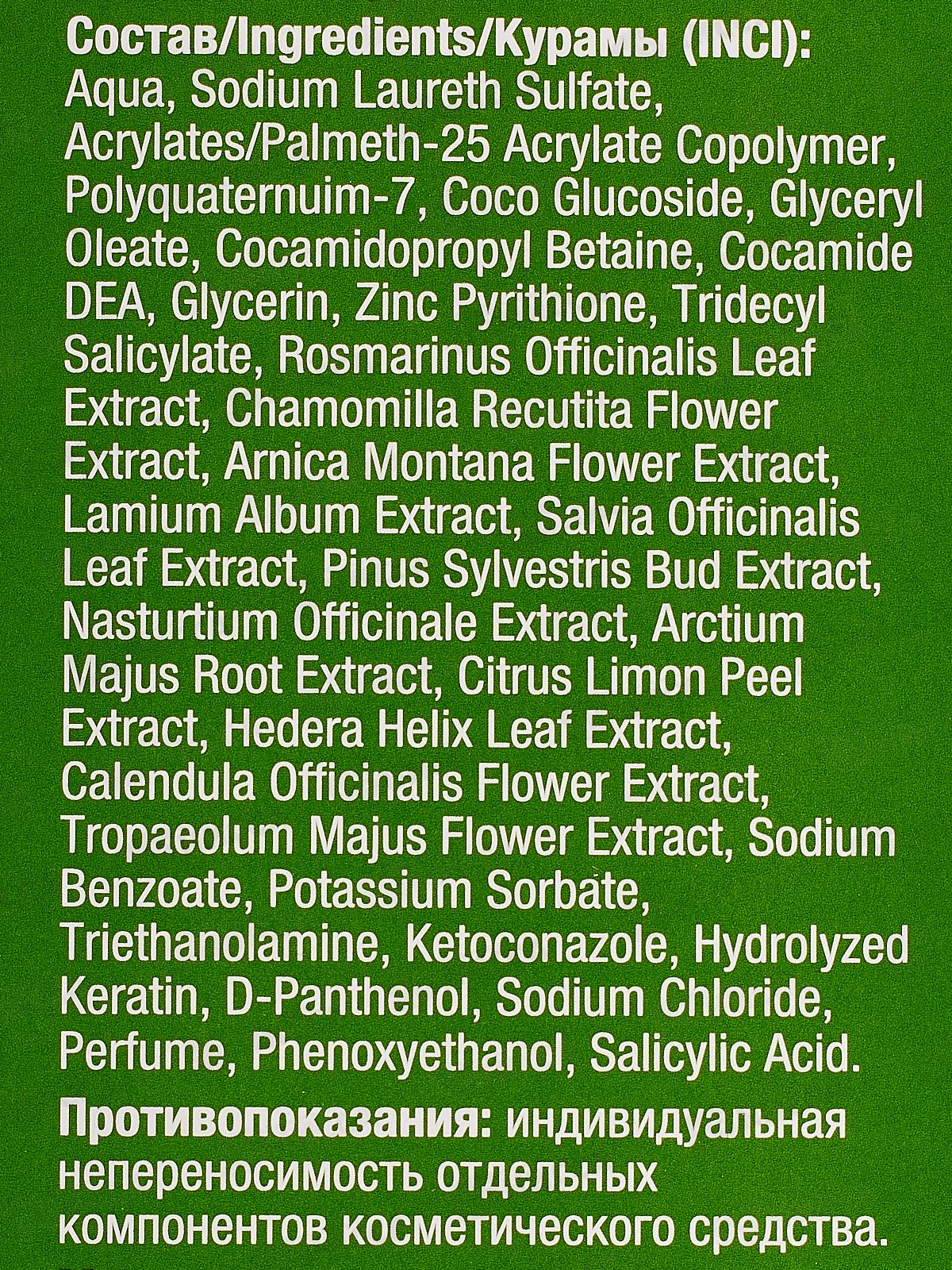 Состав: вода, Лауретсульфат натрия, Сополимер акрилатов/пальмет-25 акрилата, Поликватерниум-7, Кокоглюкозид, Глицерил олеат, Кокамидопропил бетаин, Кокамид ДЭА, Глицерин, Пиритион цинка, Тридецил салицилат, Экстракт листьев розмарина лекарственного, Экстракт цветков ромашки аптечной, Экстракт цветков арники горной, Экстракт яснотки белой, Экстракт листьев шалфея лекарственного, Экстракт почек сосны обыкновенной, Экстракт настурции лекарственной, Экстракт корня арктиума большого, Экстракт кожуры лимона, Экстракт листьев плюща обыкновенного, Экстракт цветков календулы лекарственной, Экстракт цветков тропеолума большого, Бензоат натрия, Сорбат калия, Триэтаноламин, Кетоконазол, Гидролизованный кератин, Д-пантенол, Натрий Хлорид, отдушка, феноксиэтанол, салициловая кислота.
