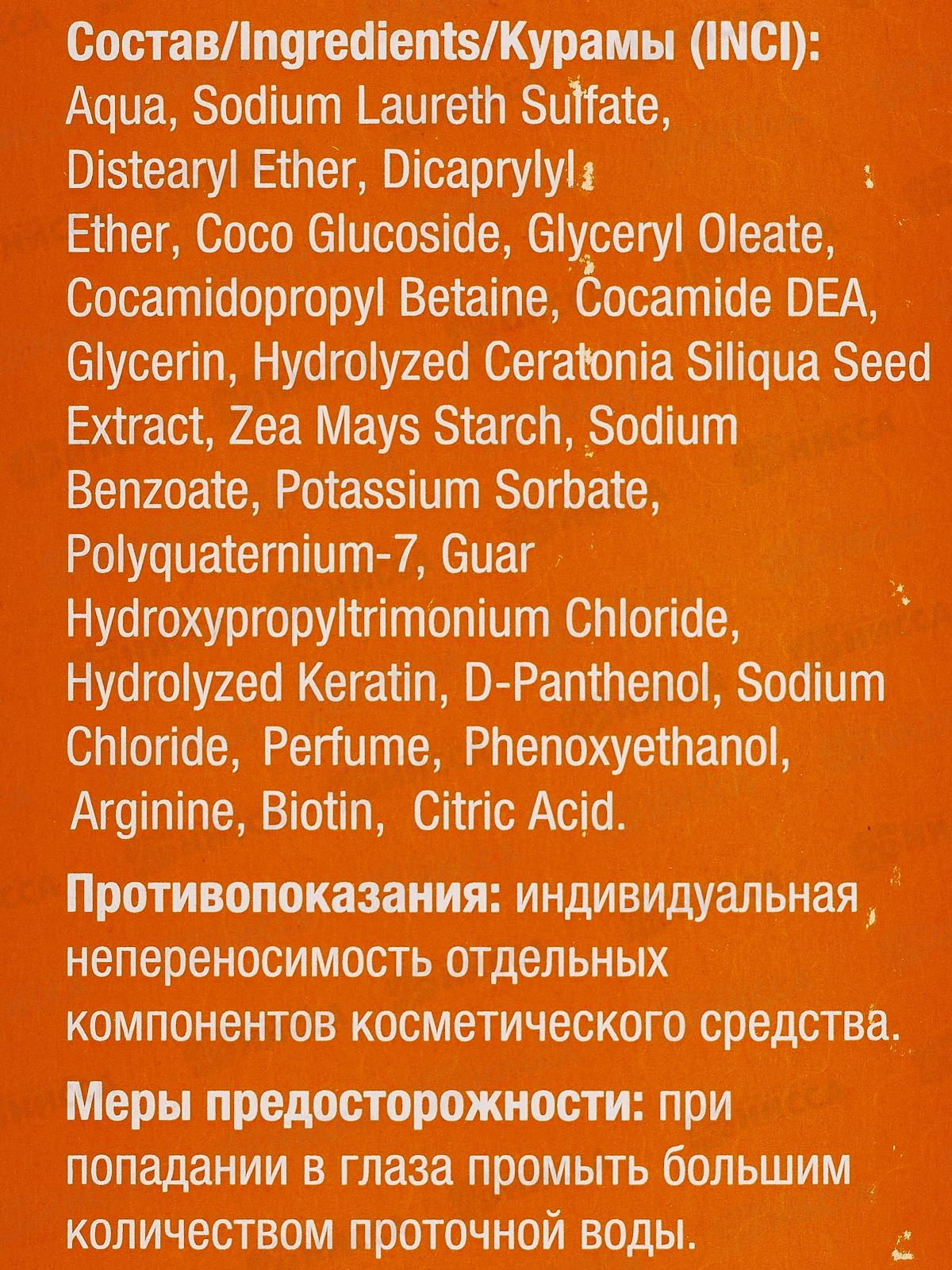 Состав: вода, лауретсульфат натрия, дистеариловый эфир, дикаприлиловый эфир, кокоглюкозид, глицерилолеат, кокамидопропилбетаин, кокамид ДЭА, глицерин, гидролизованный экстракт семян рожкового дерева, крахмал кукурузы, бензоат натрия, сорбат калия, поликватерниум-7, хлорид гуаргидроксипропилтримония, гидролизованный кератин, Д-пантенол, хлорид натрия, отдушка, феноксиэтанол, аргинин, биотин, лимонная кислота.