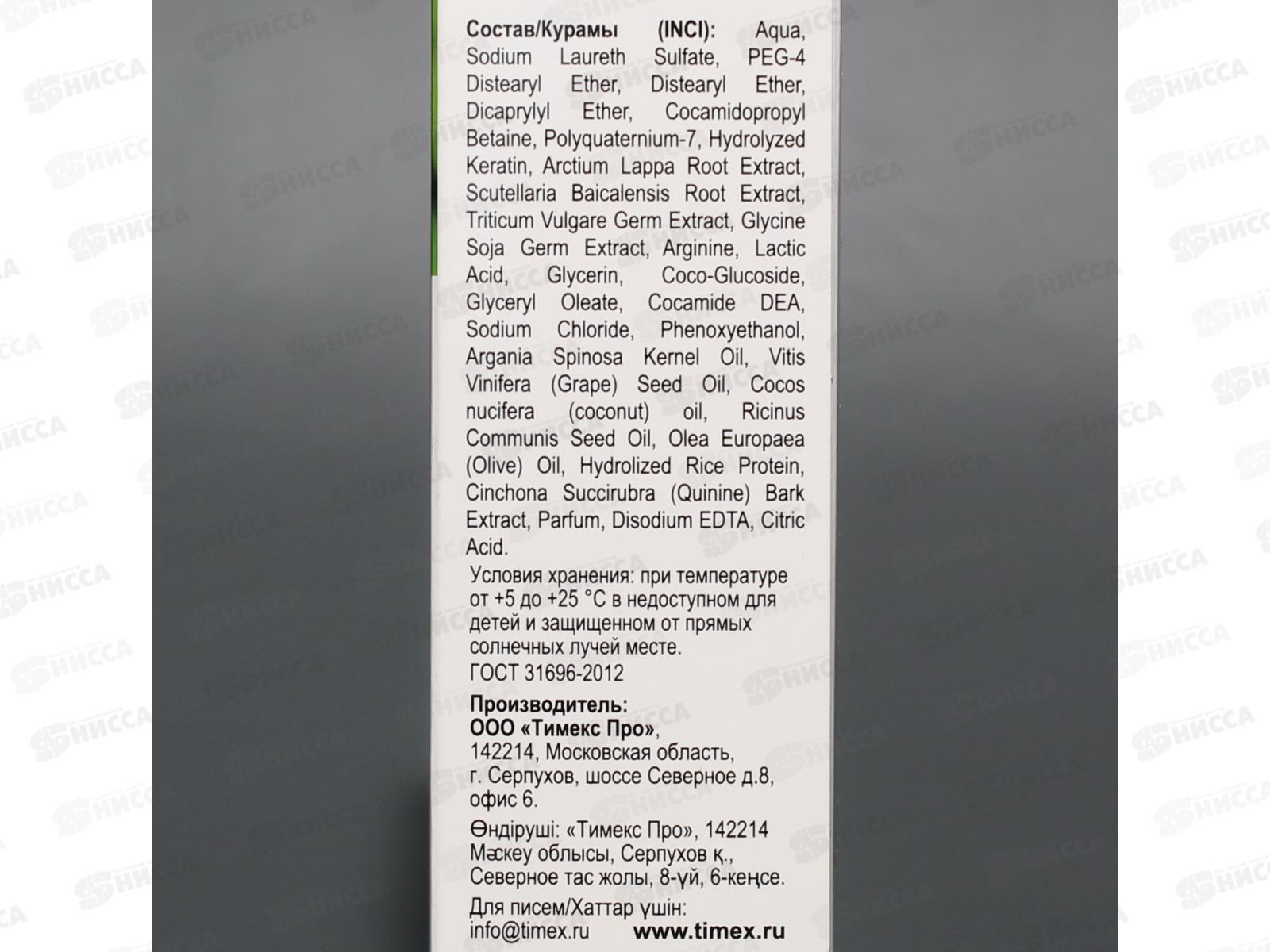 Состав: вода, Лауретсульфат натрия, Дистеариловый эфир ПЭГ-4, Дистеариловый эфир, Дикаприлиловый эфир, Кокамидопропилбетаин, Поликватерниум-7, Гидролизованный кератин, Экстракт корня лопуха, Экстракт корня шлемника байкальского, Экстракт зародышей пшеницы, Экстракт зародышей сои глициновой, Аргинин, Молочная кислота, Глицерин, Кокоглюкозид, Глицерилолеат, Кокамид ДЭА, Хлорид натрия, Феноксиэтанол, Масло косточек аргании, Масло косточек винограда (Vitis Vinifera), Масло кокоса (Cocos nucifera), Масло косточек рицинуса обыкновенного, Масло оливы европейской (Olea Europaea), Гидролизованный рисовый белок, Экстракт коры хинного дерева (Cinchona Succirubra), Парфюм, Динатриевая ЭДТА, лимонная кислота.