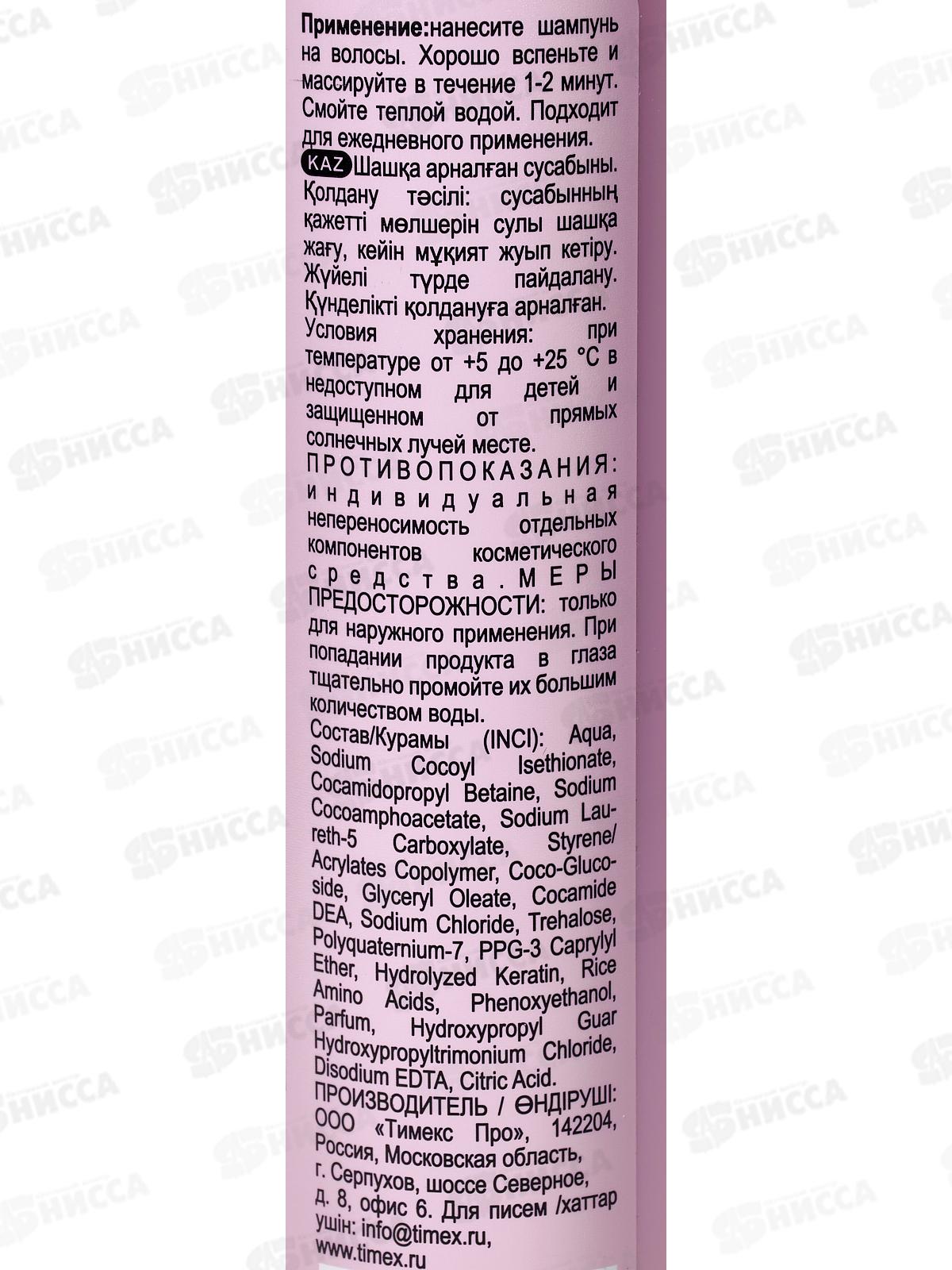 Состав: вода, кокоилизетионат натрия, кокамидопропилбетаин, кокоамфоацетат натрия, лаурет-5 карбоксилат натрия, сополимер стирола и акрилатов, кокоглюкозид, глицерилолеат, кокамид ДЭА, хлорид натрия, трегалоза, поликватерниум-7, каприлиловый эфир ППГ-3, гидролизованный кератин, аминокислоты риса, феноксиэтанол, отдушка, гидроксипропилгуар, гидроксипропилтримонийхлорид, динатриевая ЭДТА, лимонная кислота.