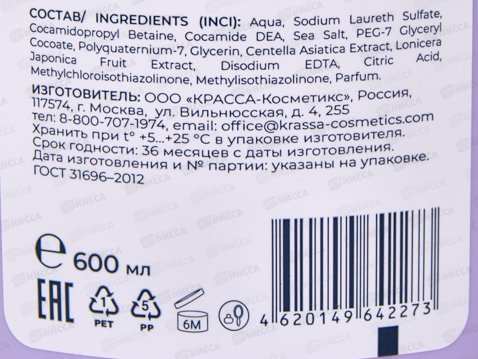 Состав: вода, Лауретсульфат натрия, Кокамидопропилбетаин, Кокамид ДЭА, Морская соль, ПЕГ-7 глицерилкокоат, Поликватерниум-7, Глицерин, Экстракт центеллы азиатской, Экстракт плодов жимолости японской, Динатриевая ЭДТА, Лимонная кислота, Метилхлоризотиазолинон, Метилизотиазолинон, Отдушка.