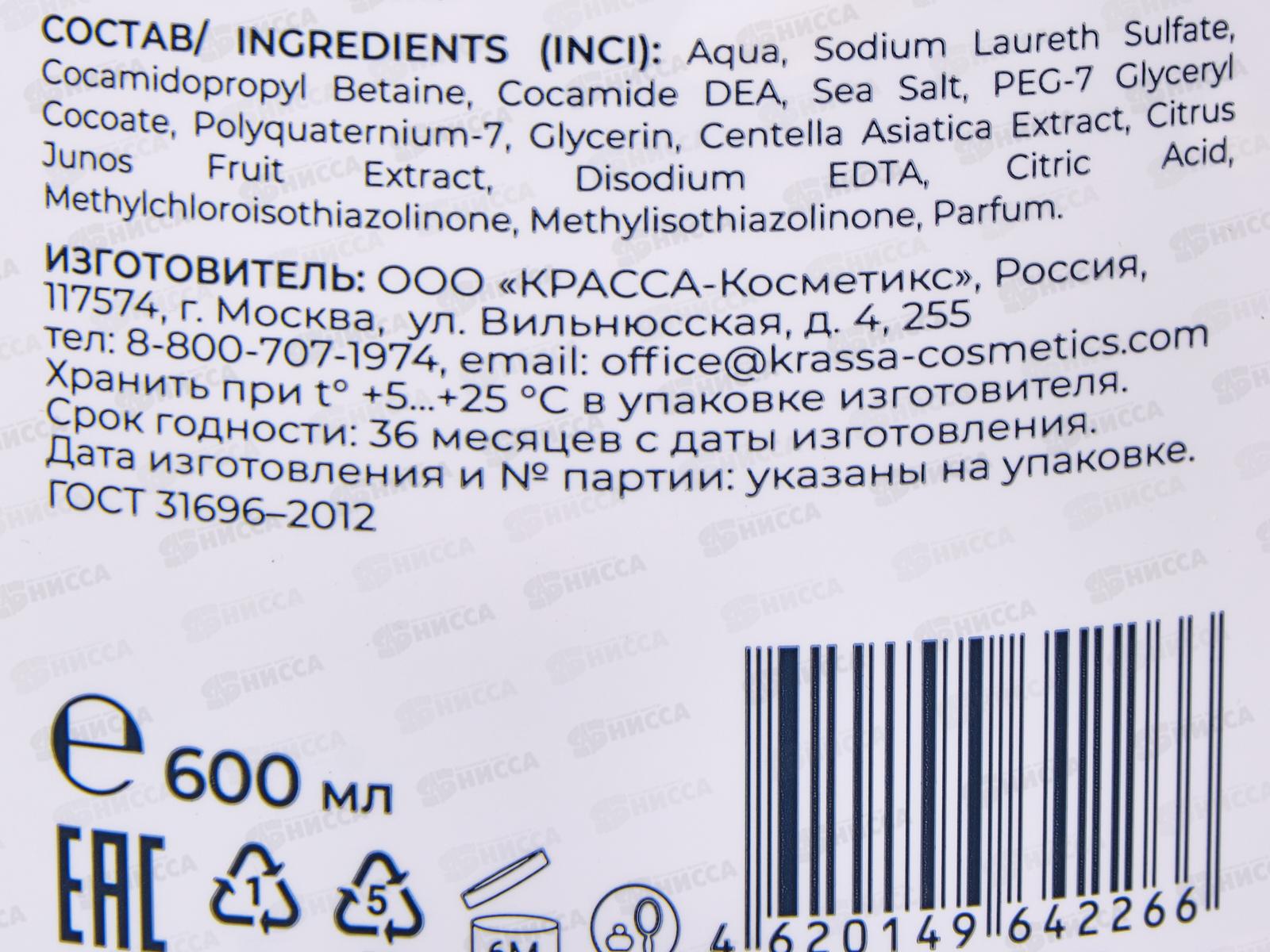 Состав: вода, Лауретсульфат натрия, Кокамидопропилбетаин, Кокамид ДЭА, Морская соль, ПЭГ-7 глицерилкокоат, Поликватерниум-7, Глицерин, Экстракт центеллы азиатской, Экстракт плодов юдзу, Динатриевая ЭДТА, Лимонная кислота, Метилхлоризотиазолинон, Метилизотиазолинон, отдушка.