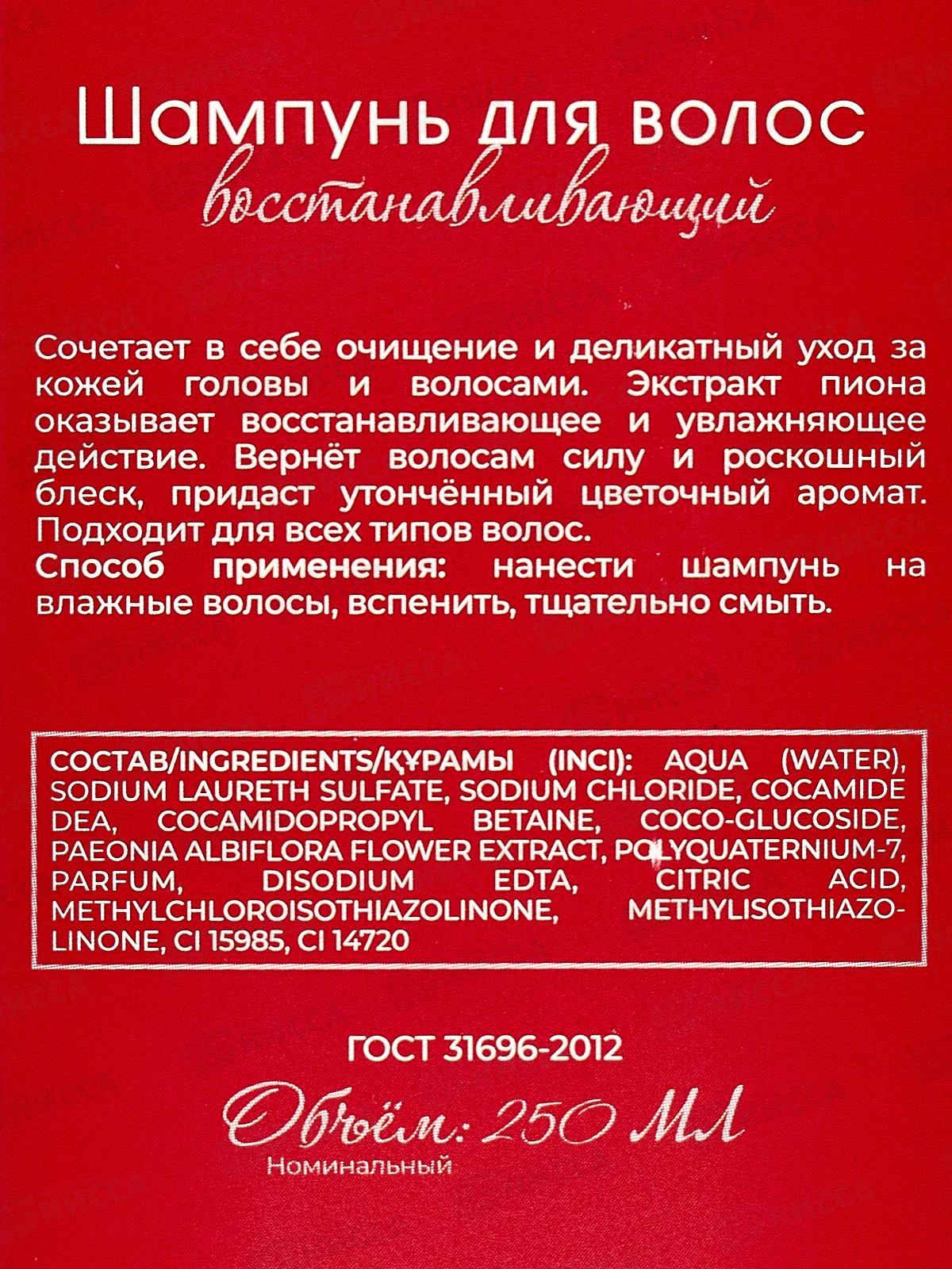 Состав шампуня: вода, лауретсульфат натрия, хлорид натрия, кокамид дэа, кокамидопропилбетаин, коко-глюкозид, экстракт цветков пиона белоцветкового, поликватерниум-7, отдушка, динатрий эдта, лимонная кислота, метилхлороизотиазолинон, метилизотиазолинон, ci 15985, сі 14720. Состав геля: вода, лауретсульфат натрия, хлорид натрия, кокамид дэа, кокамидопропилбетаин, коко-глюкозид, экстракт цветков пиона белоцветкового, гликоля дистеарат, отдушка, динатрий эдта, лимонная кислота, метилхлороизотиазолинон, метилизотиазолинон, ci 15985, сі 14720.