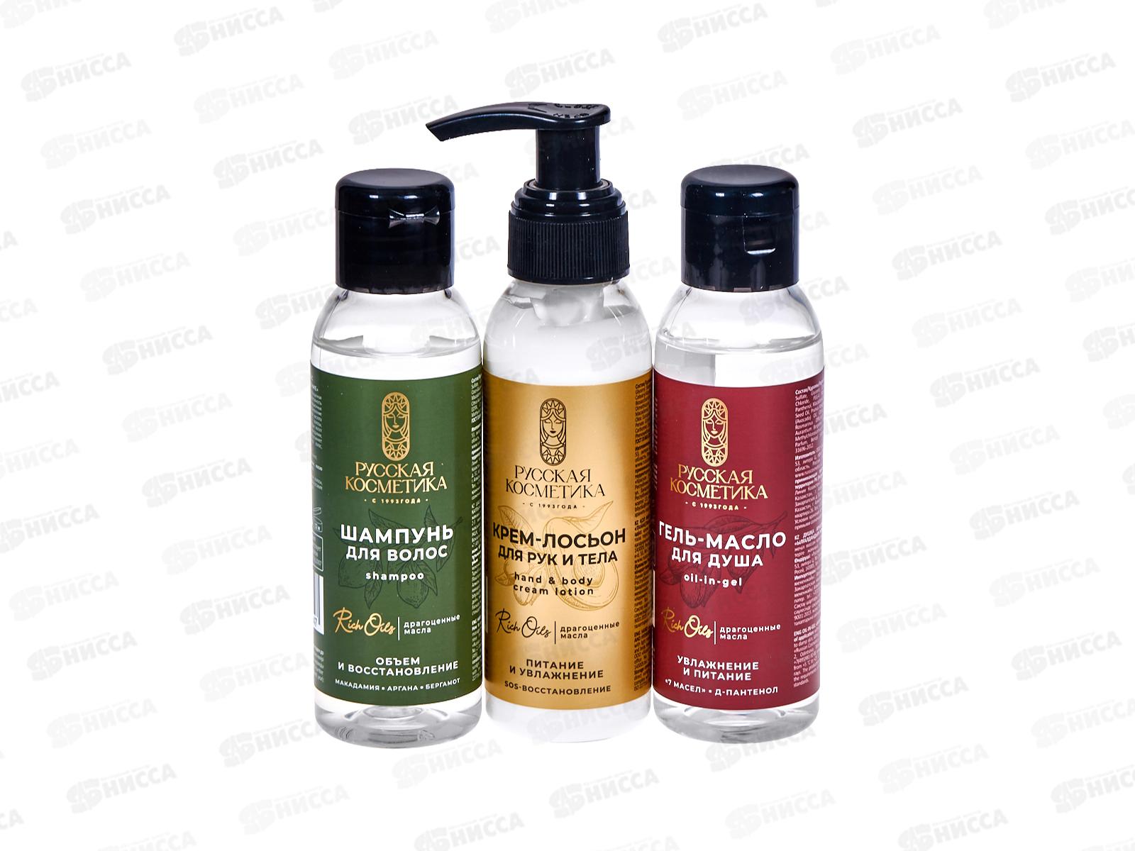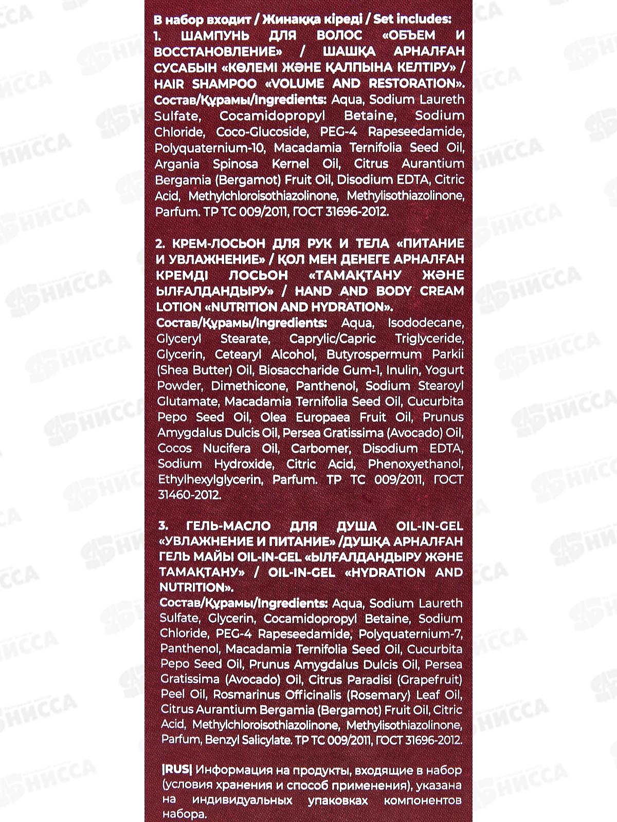 Комплектация: шампунь для волос, крем-лосьон для рук и тела, гель-масло для душа