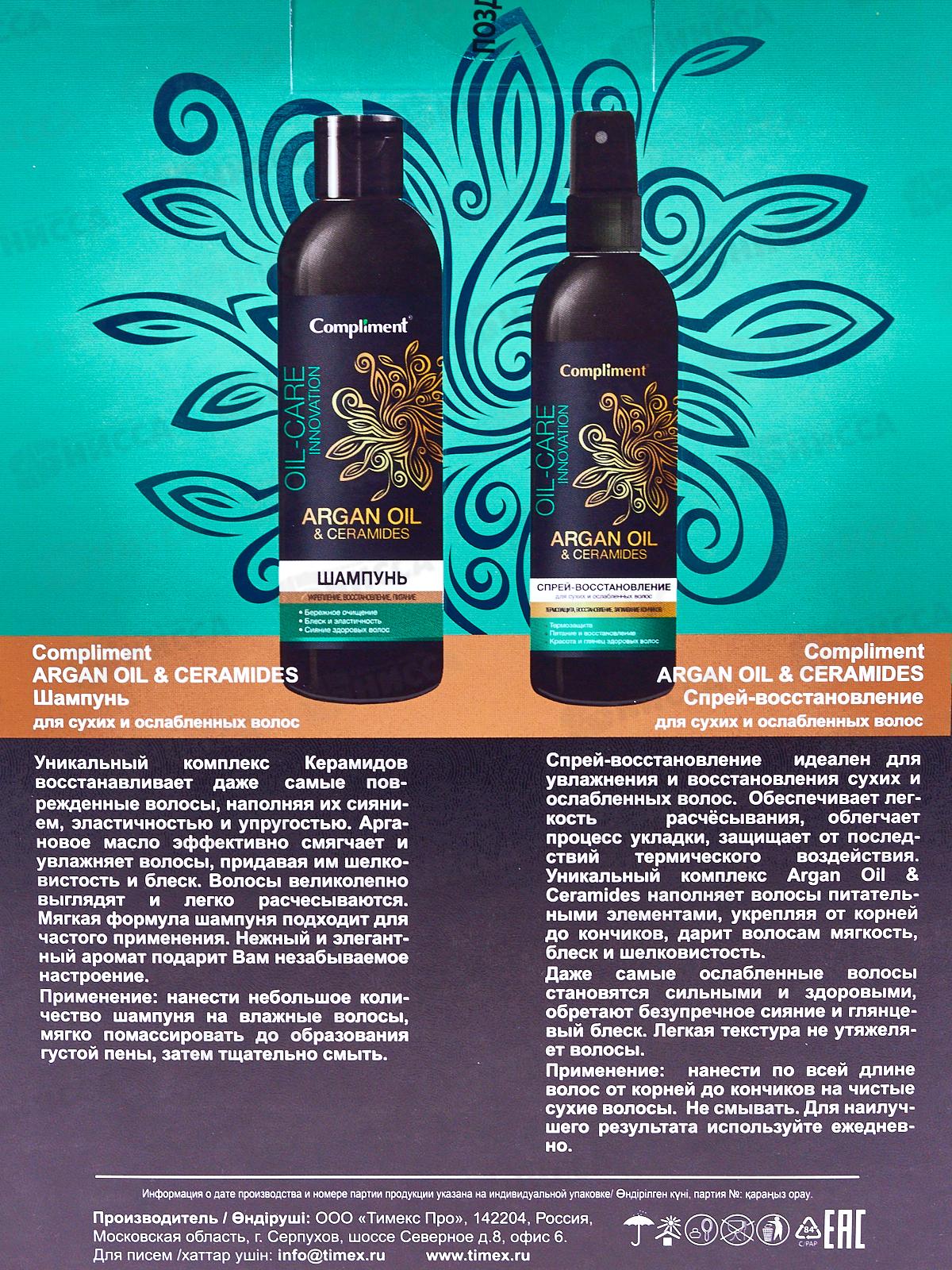 Состав шампуня: вода, лаурил глюкозид, глицерин, кокамидопропилбетаин, лауретсульфат натрия, кокамид ДЭА, ПЭГ-4 дистеариловый эфир, дистеариловый эфир, дикаприловый эфир, поликватерниум-7, хлорид натрия, феноксиэтанол, пантенол, ПЭГ-8, сополимер ПЭГ-8/SMDI, пальмитоил миристил серинат, полиакрилат натрия, пропиленгликоль, экстракт аргании колючей, парфюмерная композиция, гидроксипропилгуар, гидроксипропилтримония хлорид, лимонная кислота, динатриевая соль ЭДТА, CІ 19140, С. 16255, СІ 28440. Состав спрея: вода, глицерин, полиакриламидопропилтримония хлорид, пропиленгликоль, поликватерниум-22, ППГ-1-ПЭГ-9 лаурилгликолевый эфир, полисорбат 20, феноксиэтанол, ПЭГ-8, сополимер ПЭГ-8/SMDI, пальмитоил миристил сериналы, полиакрилат натрия, парфюмерная композиция, аргания колючая, кемелол, лимонная кислота, динатриевая соль ЭДТА.