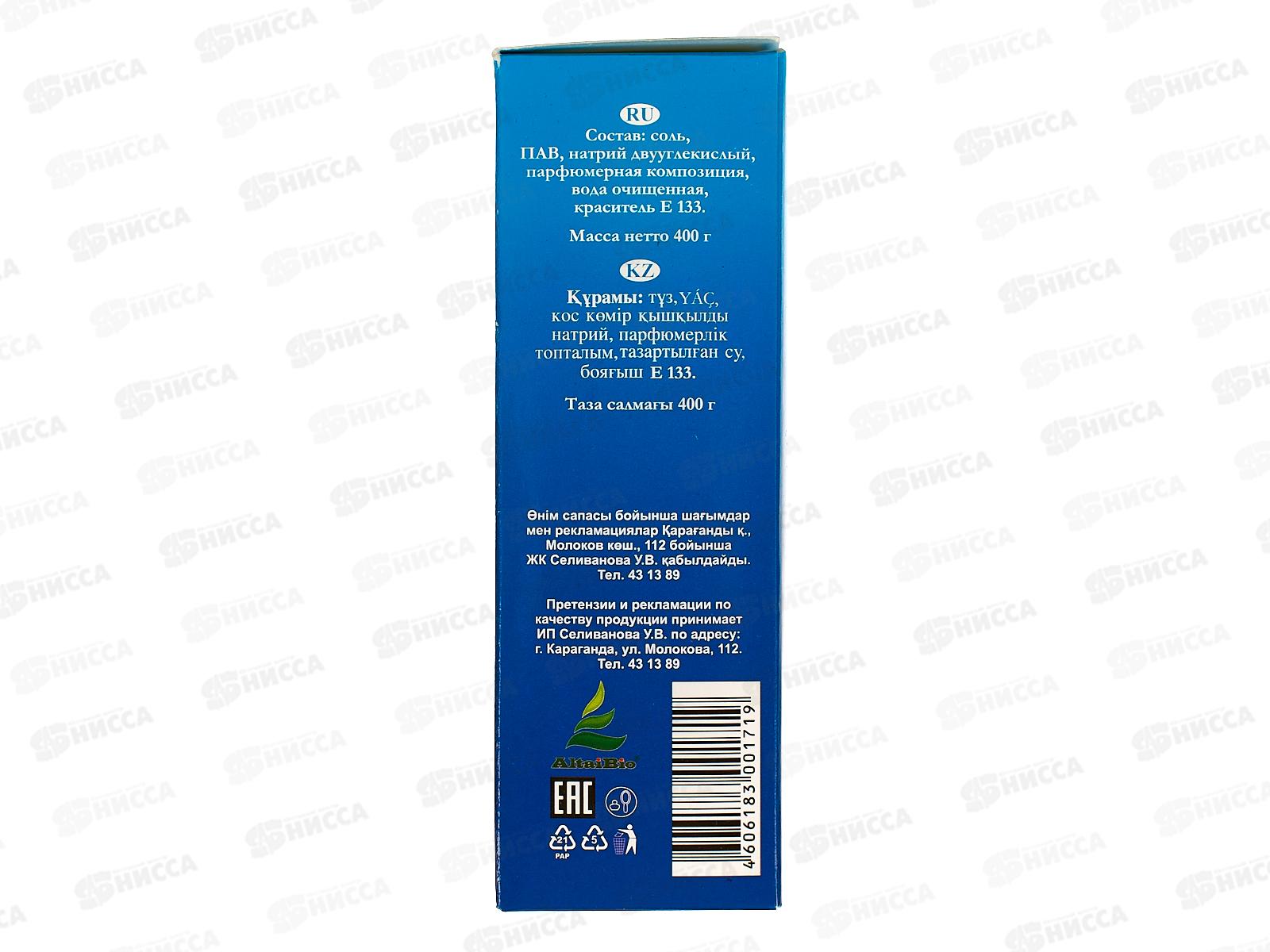 Состав: соль, ПАВ, натрий двууглекислый, парфюмерная композиция, вода очищенная, краситель Е133.