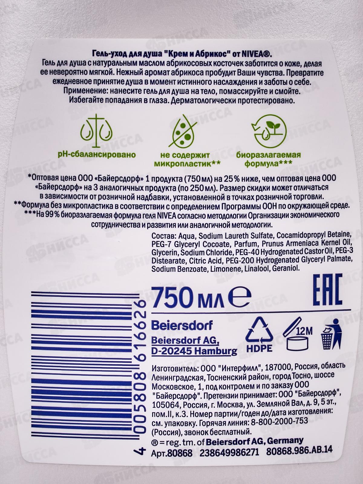 НИВЕЯ душ-гель 750мл Молоко и абрикос *6 80868