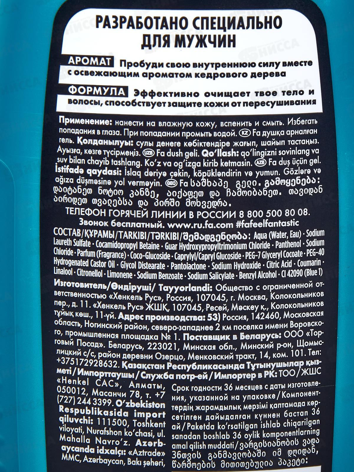Состав: вода, лауретсульфат натрия, кокамидопропилбетаин, гуар гидроксипропилтримония хлорид, пантенол, хлорид натрия, парфюмерная композиция (ароматизатор), коко-глюкозид, каприлил/каприл глюкозид, ПЭГ-7 глицерил кокоат - ПЭГ-40, гидрогенизированное касторовое масло, гликольдистеарат пантолактон, гидроксид натрия, лимонная кислота, линалоол, цитронеллол, лимонен, бензоат натрия, салицилат натрия, бензиловый спирт, CI 42090 (синий 1).