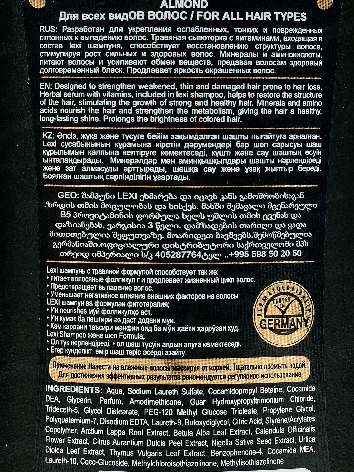 Состав: вода, Лауретсульфат натрия, Кокамидопропилбетаин, Кокамид ДЭА, Глицерин, Парфюмерная композиция, Амодиметикон, Гуар гидроксипропилтримония хлорид, Тридецет-5, Гликоль дистеарат, ПЭГ-120 метилглюкозы триолеат, Пропиленгликоль, Поликватерниум-7, Динатрий ЭДТА, Лаурет-9, Бутоксидигликоль, Лимонная кислота, Сополимер стирола/акрилатов, Экстракт корня лопуха, Экстракт листьев березы белой, Экстракт цветков календулы лекарственной, Экстракт кожуры сладкого апельсина, Экстракт семян черного тмина, Экстракт листьев крапивы двудомной, Экстракт листьев тимьяна обыкновенного, Бензофенон-4, Кокамид МЭА, Лаурет-10, Кокоглюкозид, Метилхлоризотиазолинон, Метилизотиазолинон.