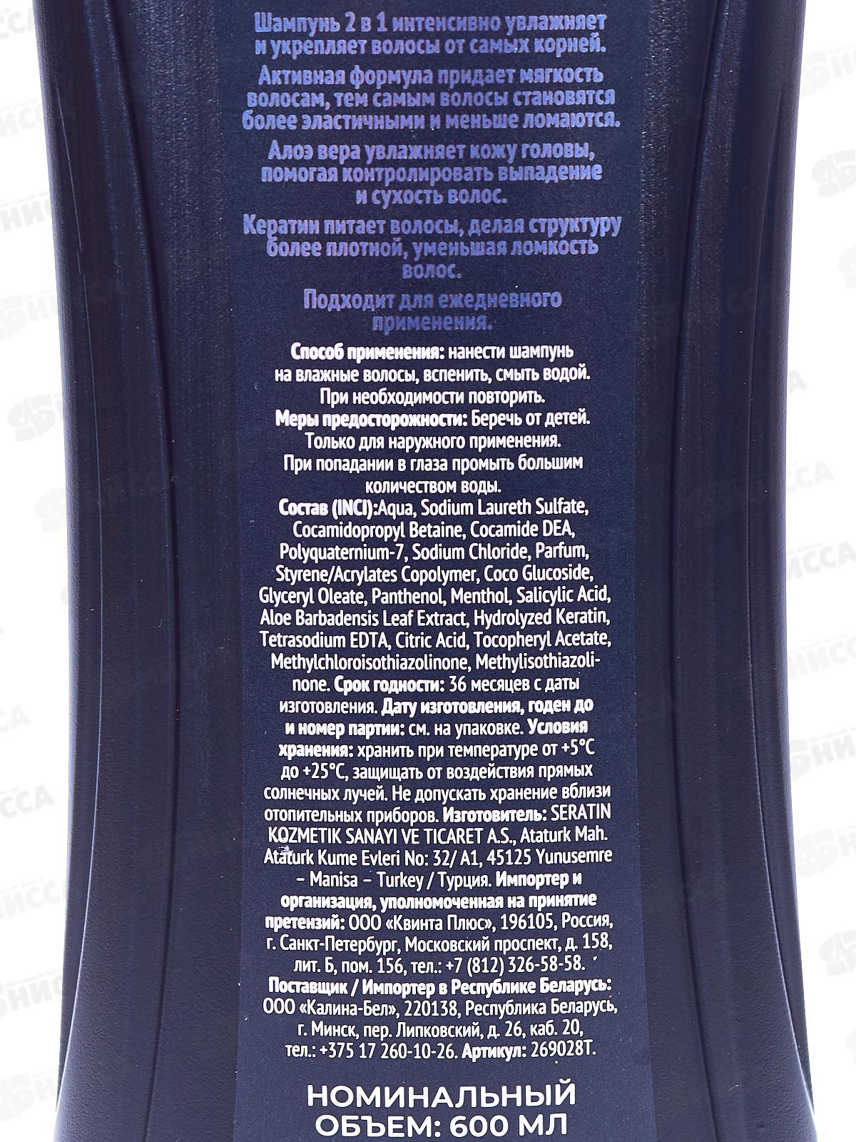 Состав: вода, лауретсульфат натрия, кокамидопропилбетаин, кокамид ДЭА, поликватерниум-7, хлорид натрия, отдушка, сополимер стирола и акрилатов, кокоглюкозид, глицерилолеат, пантенол, ментол, салициловая кислота, экстракт листьев алоэ вера, гидролизованный кератин, тетранатрий ЭДТА, лимонная кислота, токоферилацетат, метилхлоризотиазолинон, метилизотиазолинон.