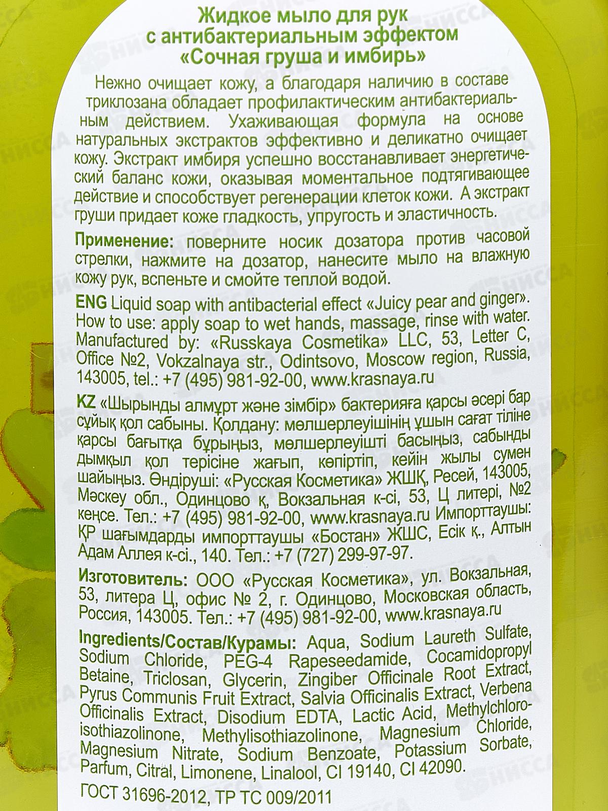 КРАСНАЯ ЛИНИЯ мыло жидкое Сочная груша и Имбирь с антибактериальный эффект 500г *12
