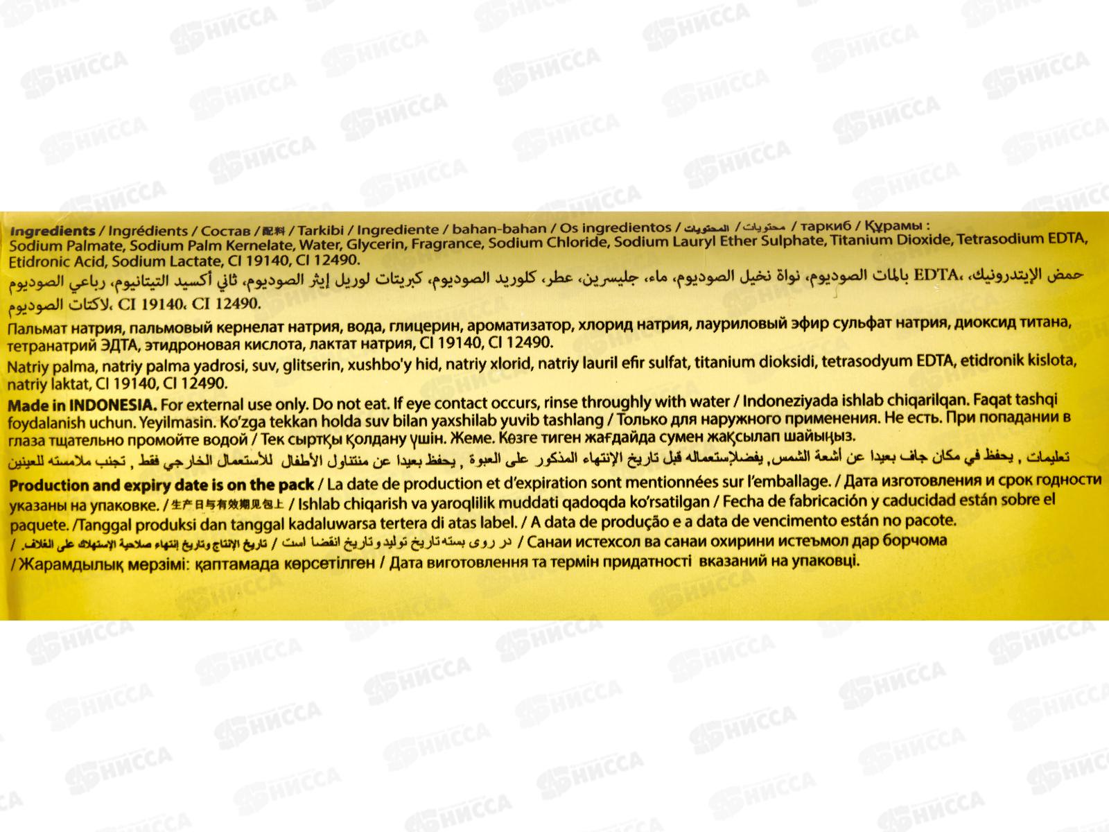 Состав: пальмат натрия, пальмовый кернелат натрия, вода, глицерин, ароматизатор, хлорид натрия, лауриловый эфир сульфат натрия, диоксид титана, тетранатрий ЭДТА, этидроновая кислота, лактат натрия, Cl 19140, CI 12490.