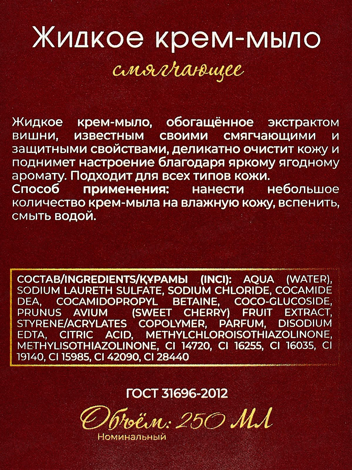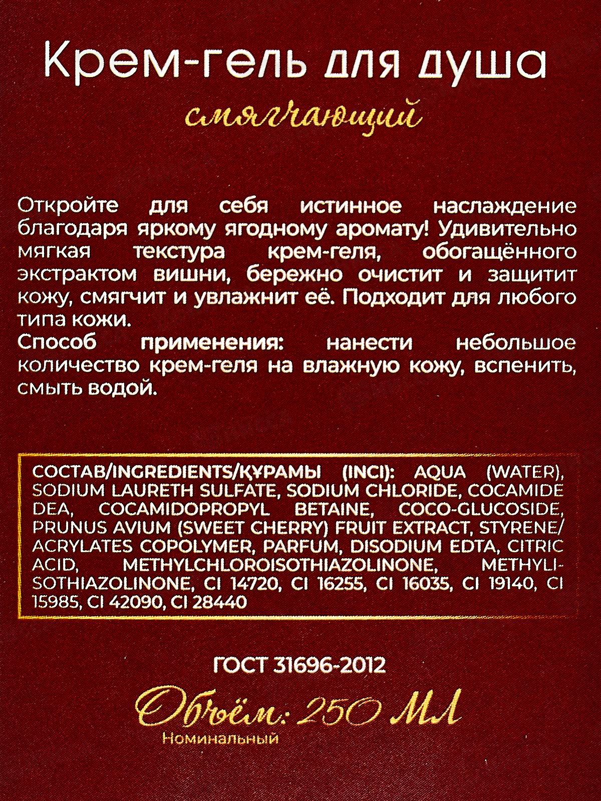 Состав геля для душа: Вода, лауретсульфат натрия, хлорид натрия, кокамид ДЭА, кокамидопропилбетаин, кокоглюкозид, экстракт плодов вишни, сополимер стирола и акрилатов, парфюмерная композиция, динатриевая соль ЭДТА, лимонная кислота, метилхлоризотиазолинон, метилизотиазолинон, красители (CI 14720, CI 16255, CI 16035, CI 19140, CI 15985, CI 42090, CI 28440). Состав жидкого мыла: Вода, лауретсульфат натрия, хлорид натрия, кокамид ДЭА, кокамидопропилбетаин, кокоглюкозид, экстракт плодов вишни, сополимер стирола и акрилатов, парфюмерная композиция, динатриевая соль ЭДТА, лимонная кислота, метилхлоризотиазолинон, метилизотиазолинон, красители (CI 14720, CI 16255, CI 16035, CI 19140, CI 15985, CI 42090, CI 28440).