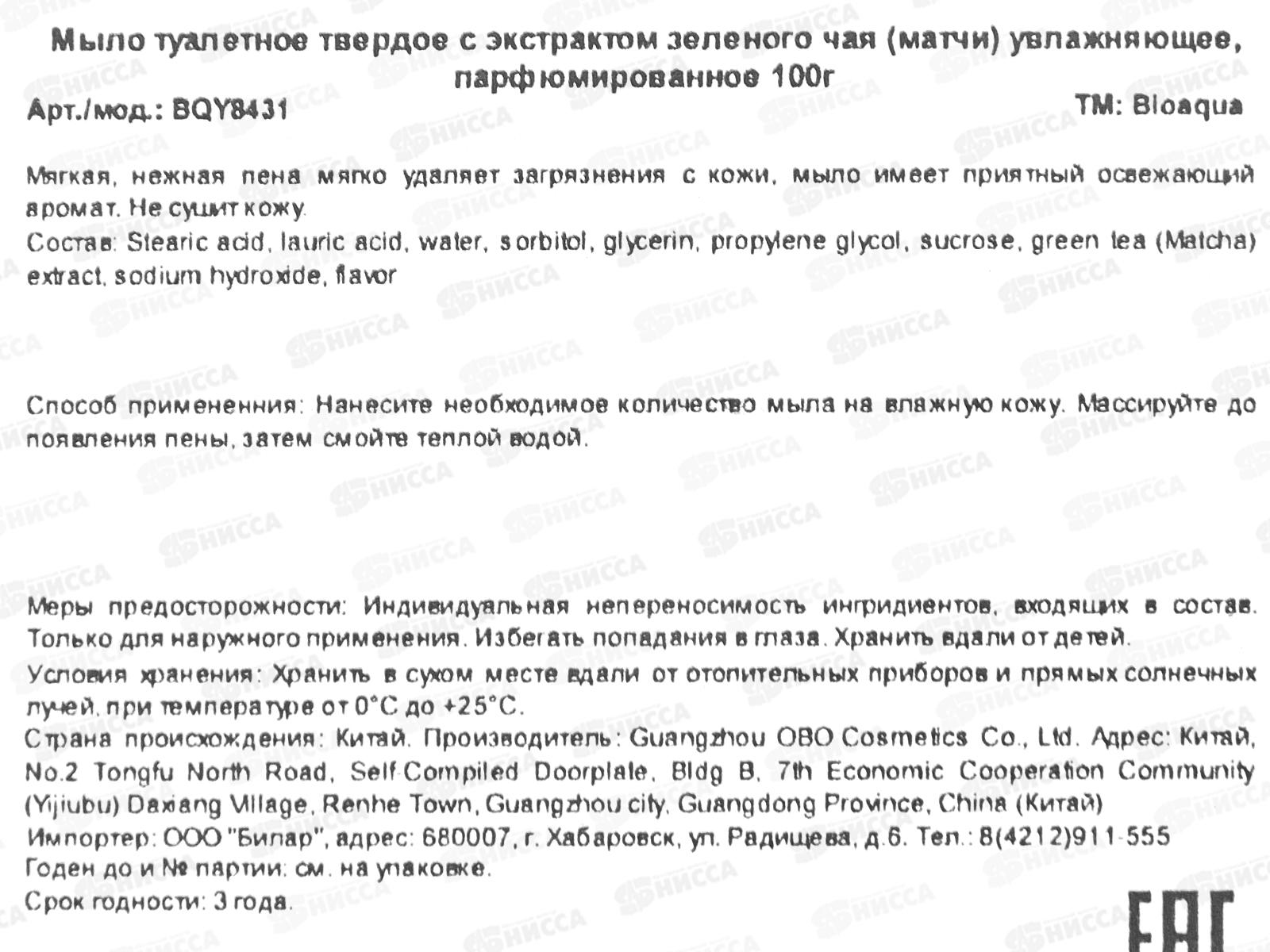 OBO Bioaqua мыло 100гр Увлаж очищ Экстракт Зеленого чая *1