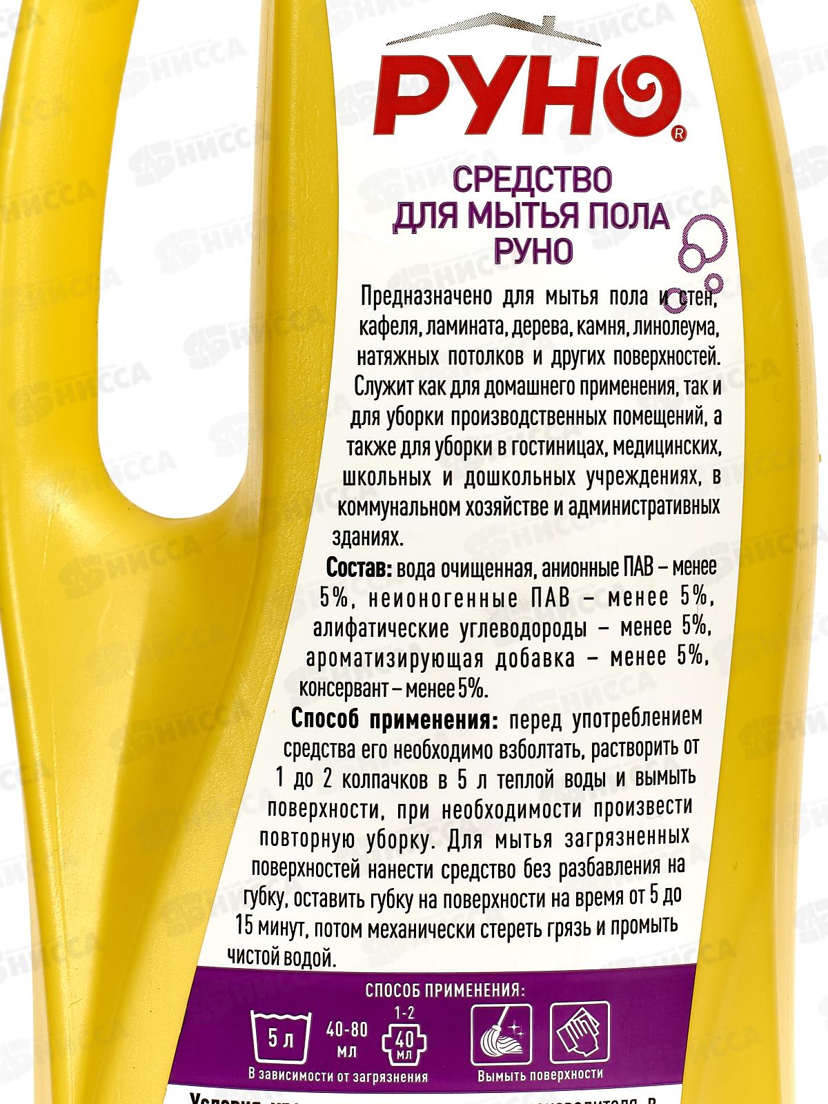 Средство для мытья пола Руно - низко пенное средство для мытья полов при ежедневной влажной уборки дома, удаляет загрязнения без разводов и липкого эффекта, устраняет запахи и бактерии. - Моющее средство Руно подходит для мытья всех видов напольных покрытий, синтетических, виниловых, пластика, натяжного потолка, поверхностей из линолеума, дерева, паркета, ламината, бетона, облицовочной плитки, стекла, гранита и мрамора. - Используется как в быту, так и в подсобных помещениях, на объектах социальной и общественной сферы, отелях, бизнес-центрах, гипермаркетах, коммунальном хозяйстве, - Состав не содержит агрессивных компонентов, поэтому не наносит вреда покрытию. Безопасен для детей, животных и домашних питомцев. Оставляет приятный легкий аромат, чистоту и свежесть после применения. Способ применения: перед употреблением средство взболтать, растворить от 1 до 2 колпачков в 5 л. теплой воды, вымыть поверхность, при необходимости произвести повторную уборку. Для мытья загрязнённых поверхностей нанести средство без разбавления на губку, оставить губку на поверхности от 5 до 15 минут, потом механически стереть грязь, и промыть чистой водой. СОСТАВ: вода очищенная, анионные ПАВ менее 5%, неиогенные ПАВ менее 5%, алифатические углеводороды менее 5%, ароматизирующая добавка менее 5%, консервант менее 5%. ФАКТОРЫ УСПЕХА: - Экономичный расход. - Не требует смывания водой. Нейтральное. - Низко пенное, не оставляет разводов. - Антибактериальный и антистатический эффекты, антипыль. - Отмывает самые сильные загрязнения. ОБЛАСТЬ ПРИМЕНЕНИЯ: предназначено для применения в быту, в пищевой промышленности, на предприятиях общественного питания в учреждениях дошкольного и общего образования. Допускается использование средства в учреждениях медицинского профиля по назначению.