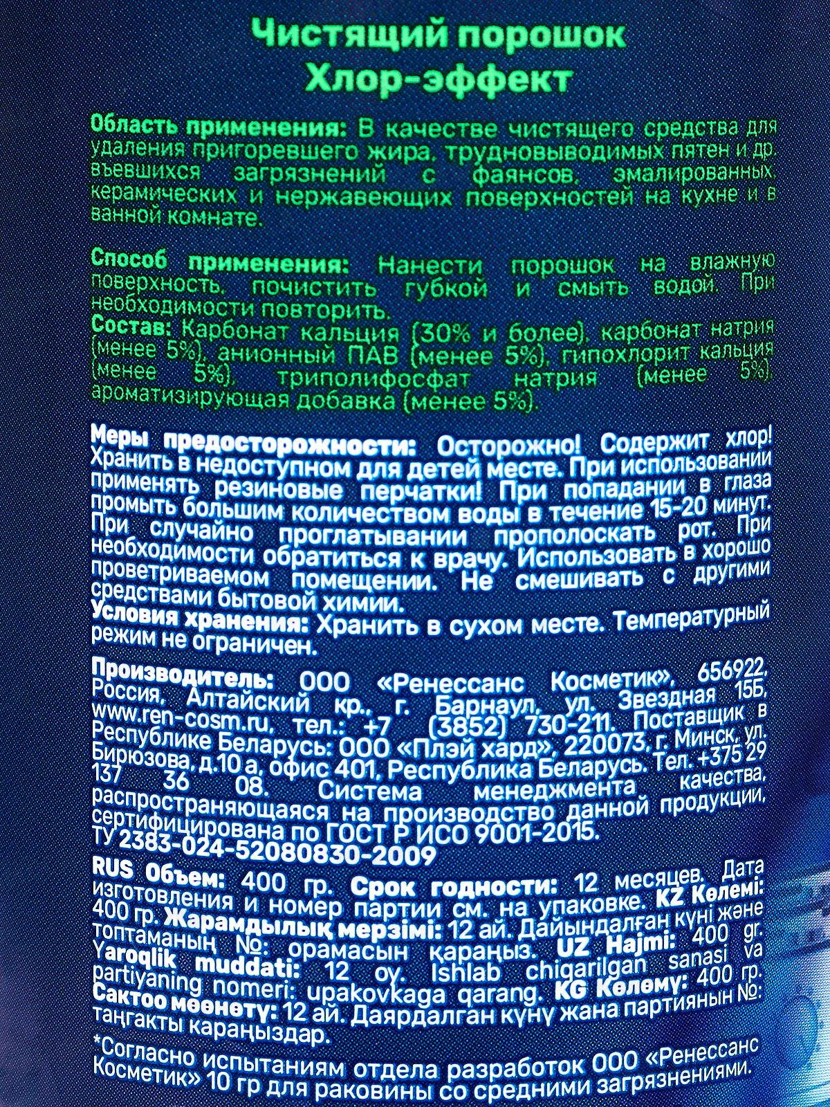 Состав: карбонат кальция (30% и более); карбонат натрия (менее 5%); анионные ПАВы (менее 5%); кислота щавелевая (менее 5%); парфюмерная композиция (менее 5%).