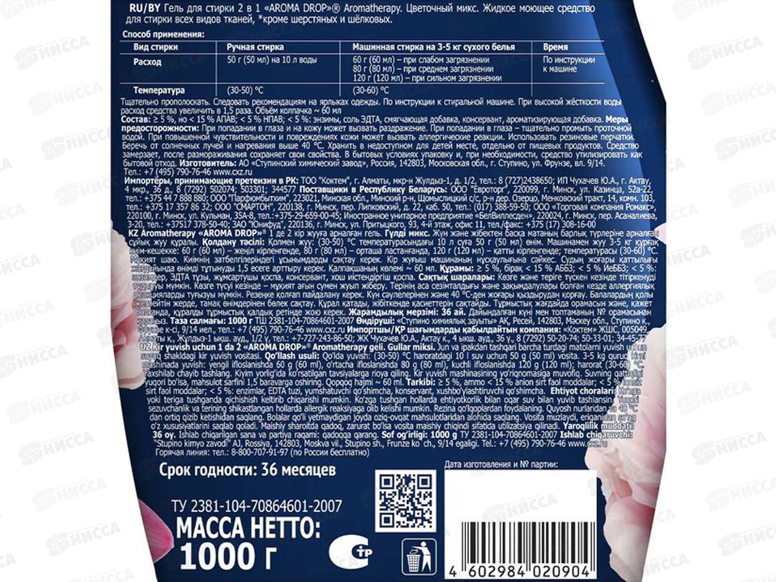 Aroma Drop гель для стирки 2в1 Цветочный микс 1000г Акция *6