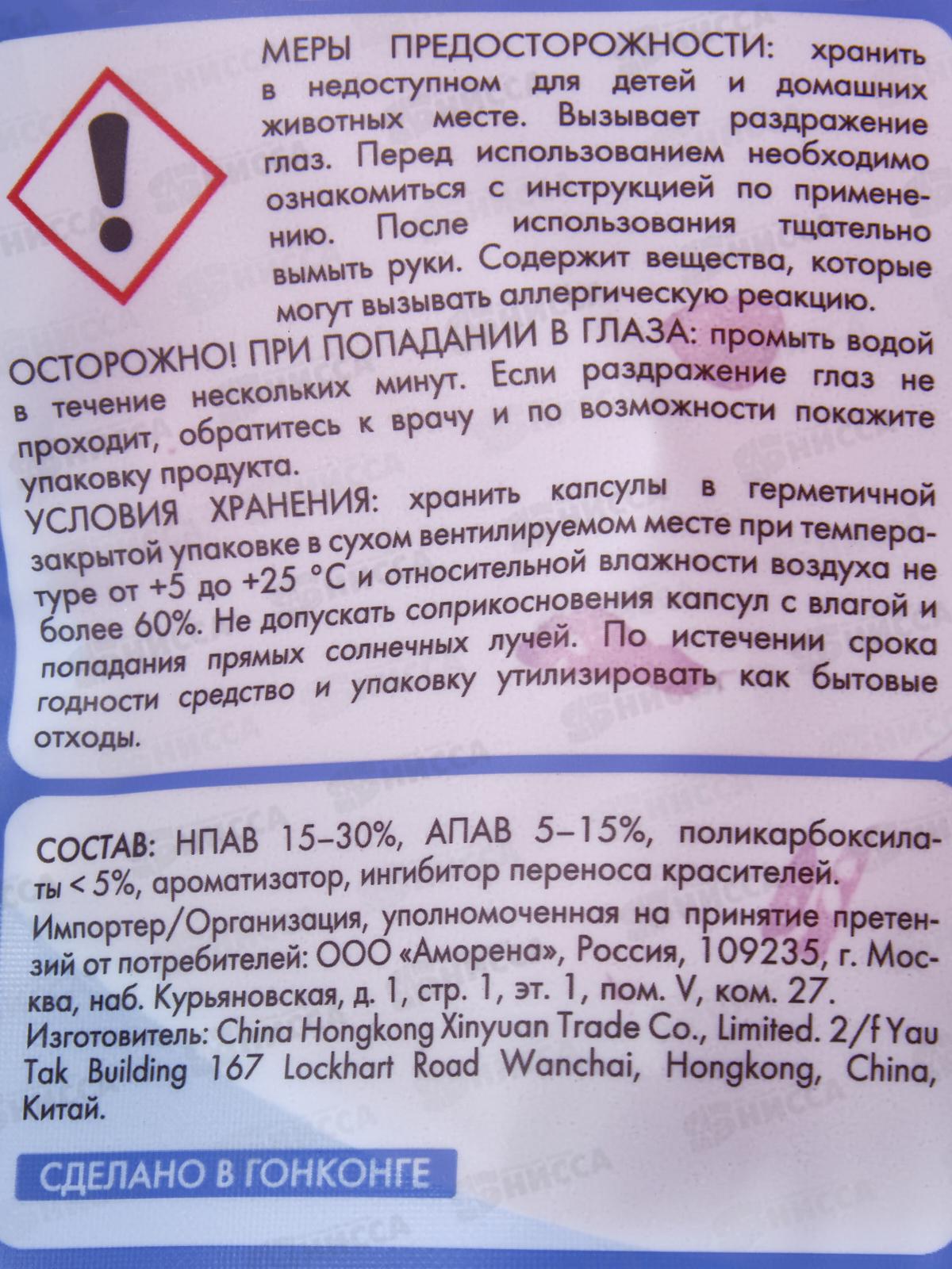 Состав: НПАВ 15-30%, АПАВ 5-15%, поликарбоксилаты <5%, ароматизатор, ингибитор переноса красителей.