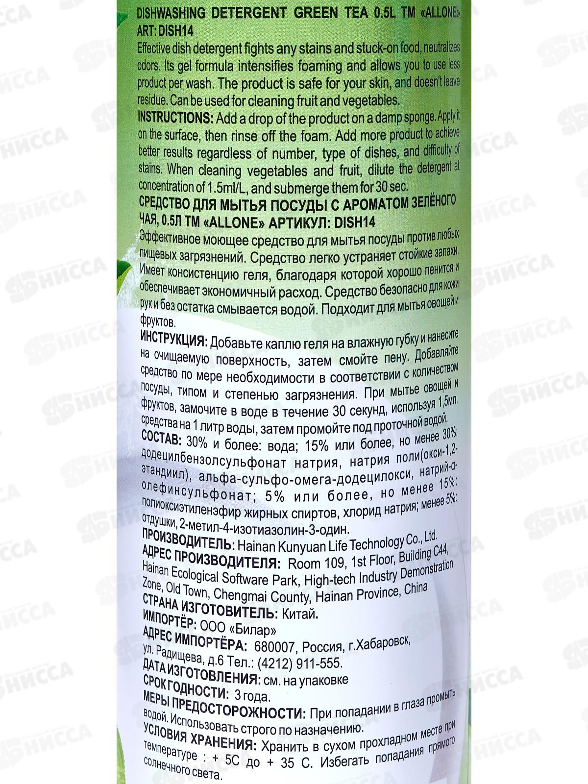 Allone гель для посуды и овощей Зеленый чай 500мл *30