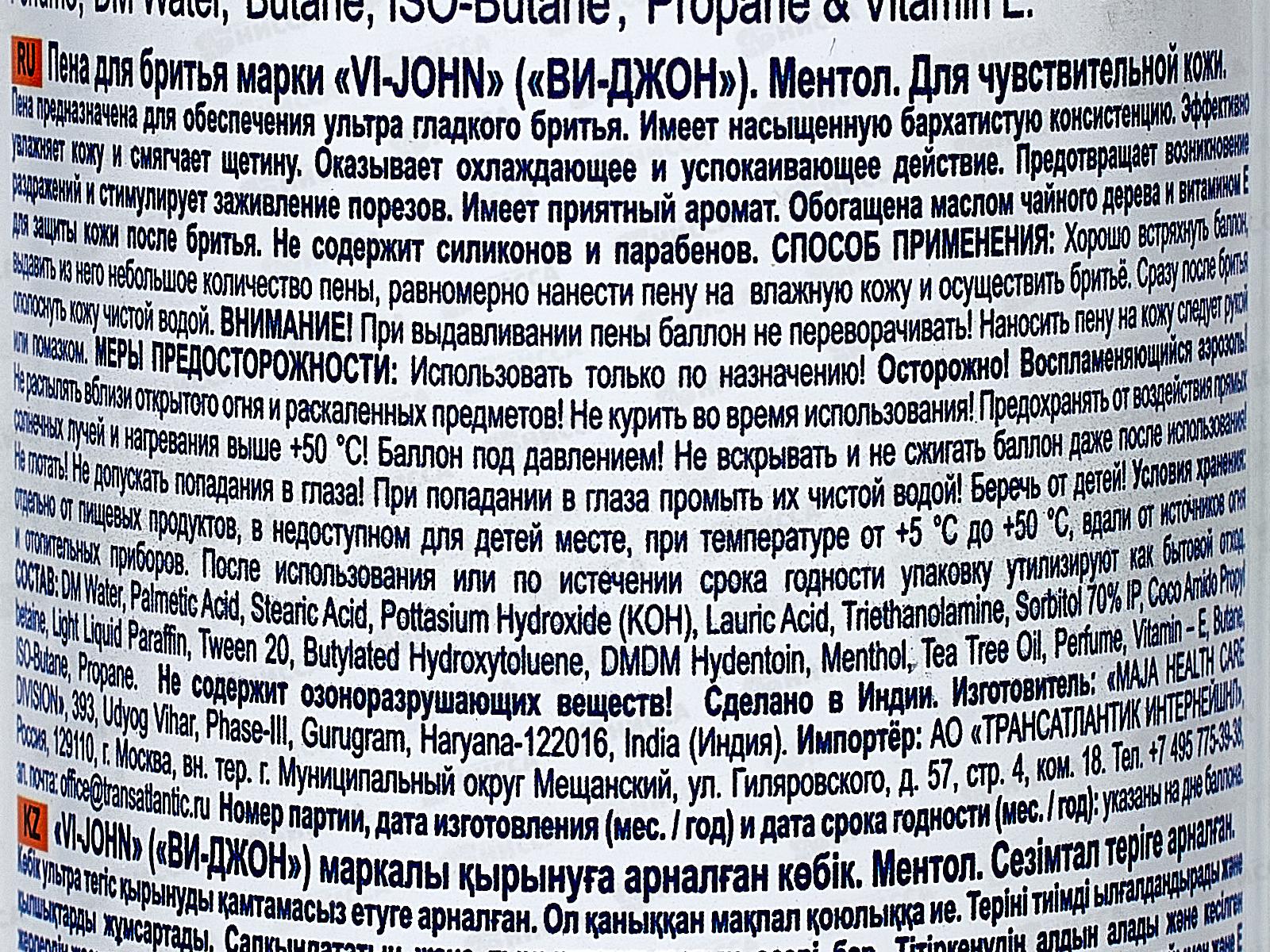 Состав: DM вода, пальметиновая кислота, стеариновая кислота, гидроксид калия (KOH), лауриновая кислота, триэтаноламин, сорбит 70% IP, кокоамидопропилбетаин, легкий жидкий парафин, твин 20, бутилгидрокситолуол, DMDM гидентоин, ментол, масло чайного дерева, отдушка, витамин Е, бутан, изобутан, пропан.