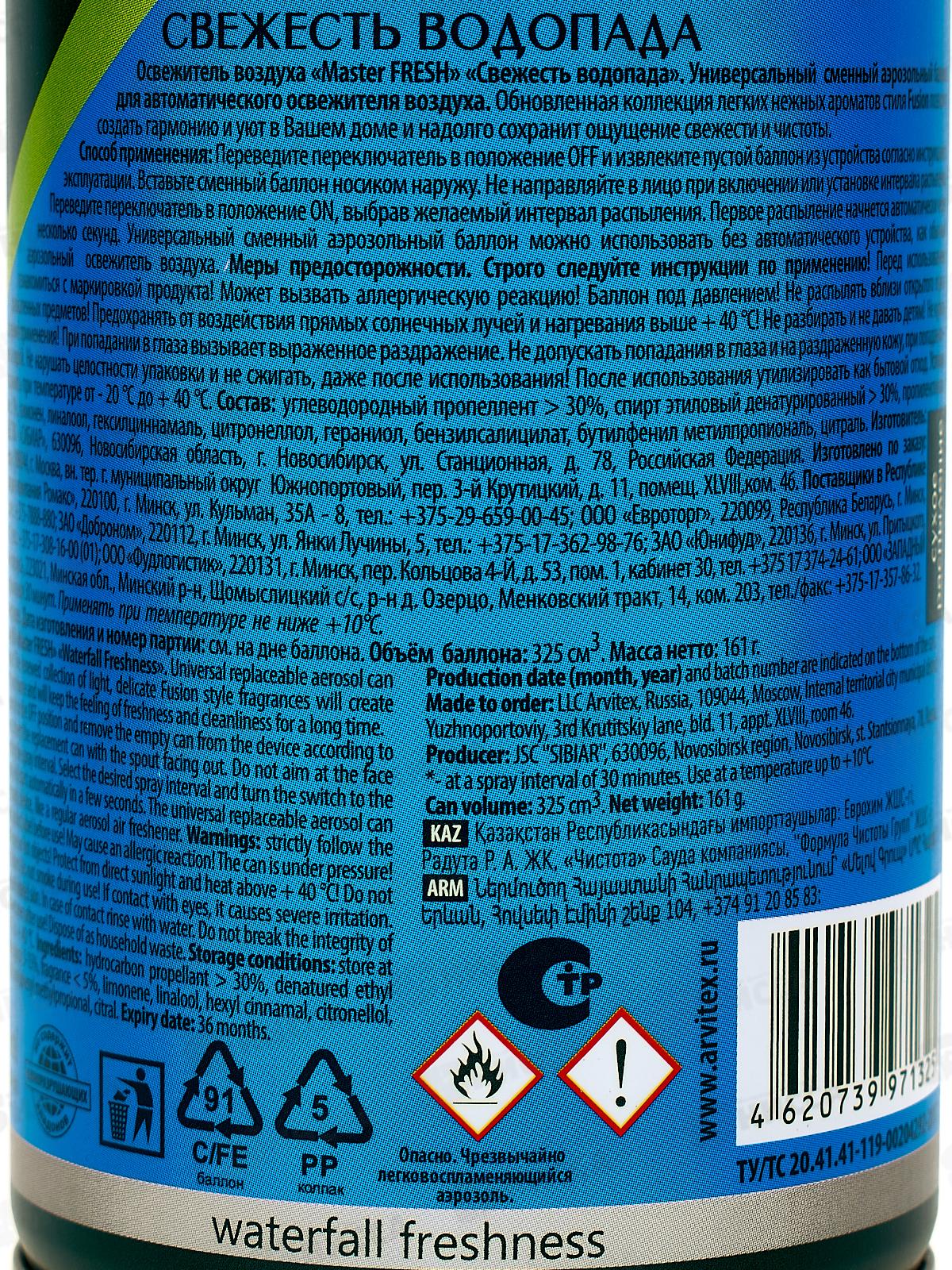 Master FRESH освежитель воздуха сменный баллон Свежесть водопада 250мл *12 С0006613