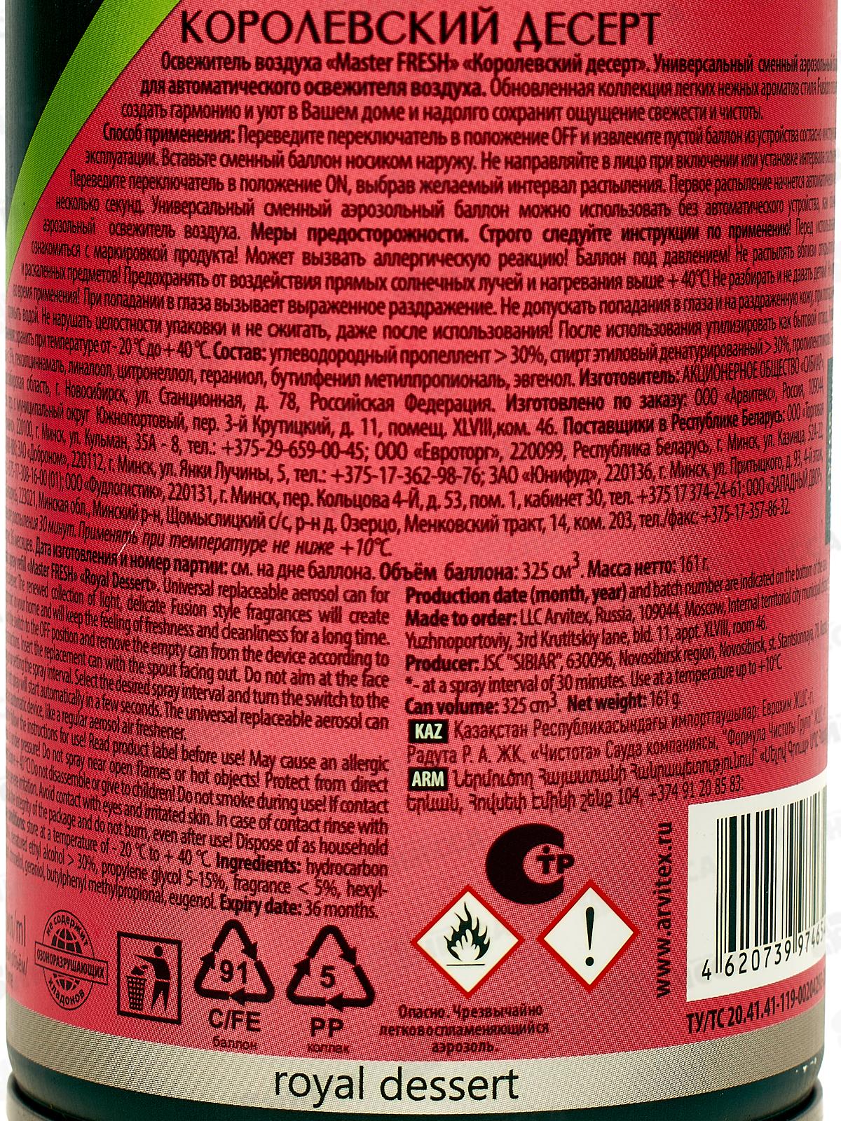 Master FRESH освежитель воздуха сменный баллон Королевский десерт 250мл *12 С0006616