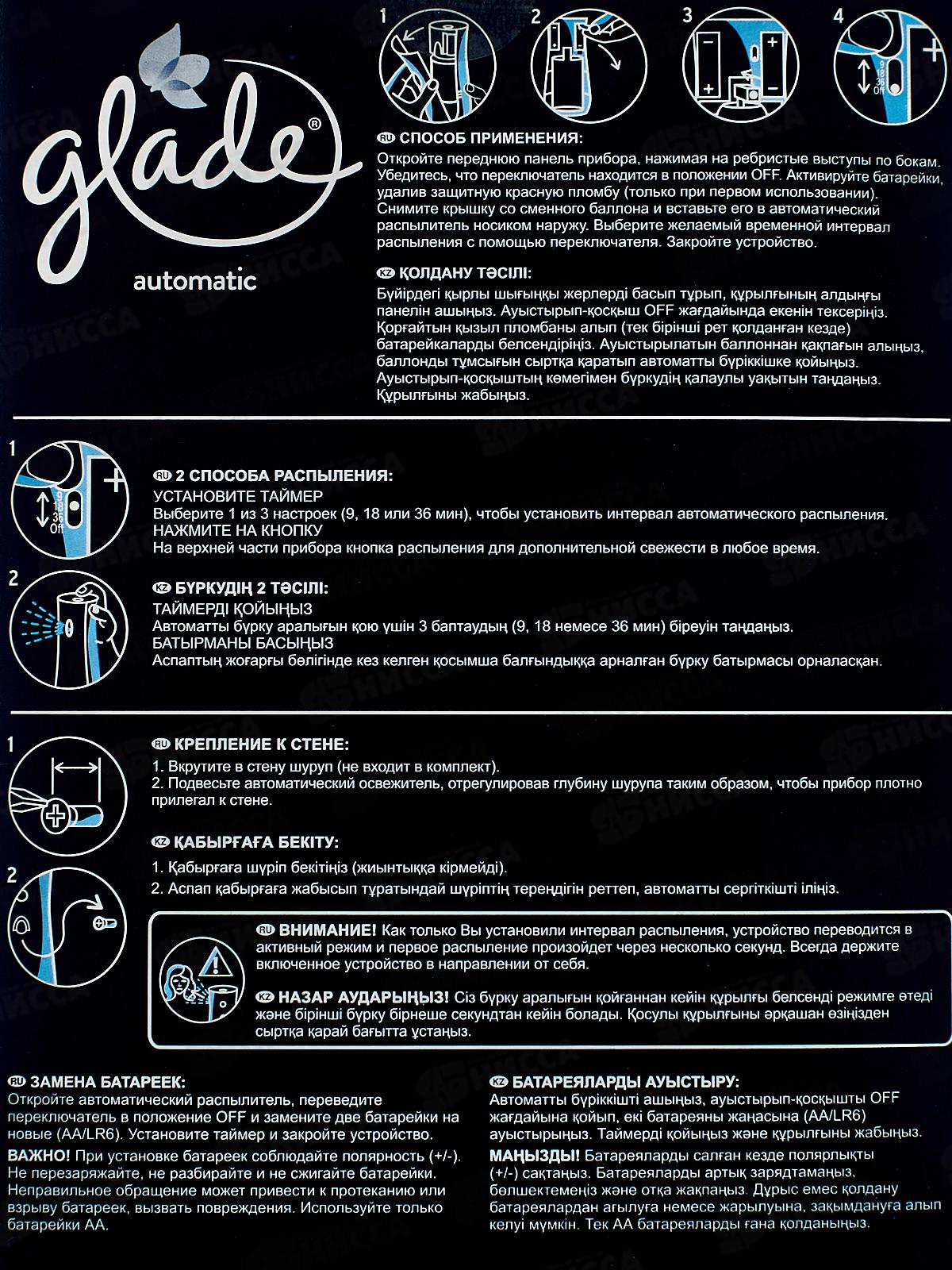Комплектация: аэрозольный диспенсер, сменный баллон, 2 батарейки типа АА
