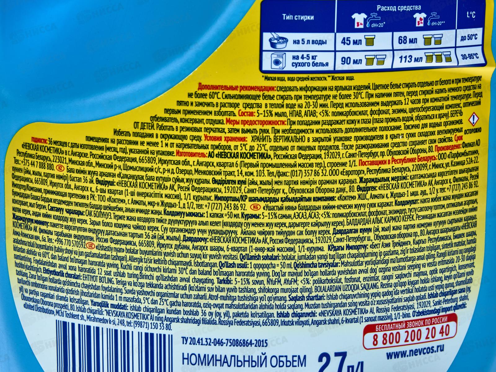 Состав: 5–15% мыло, НПАВ, АПАВ; <5%: поликарбоксилат, фосфонат, энзимы, цветосберегающий комплекс, оптический отбеливатель, консервант, отдушка.