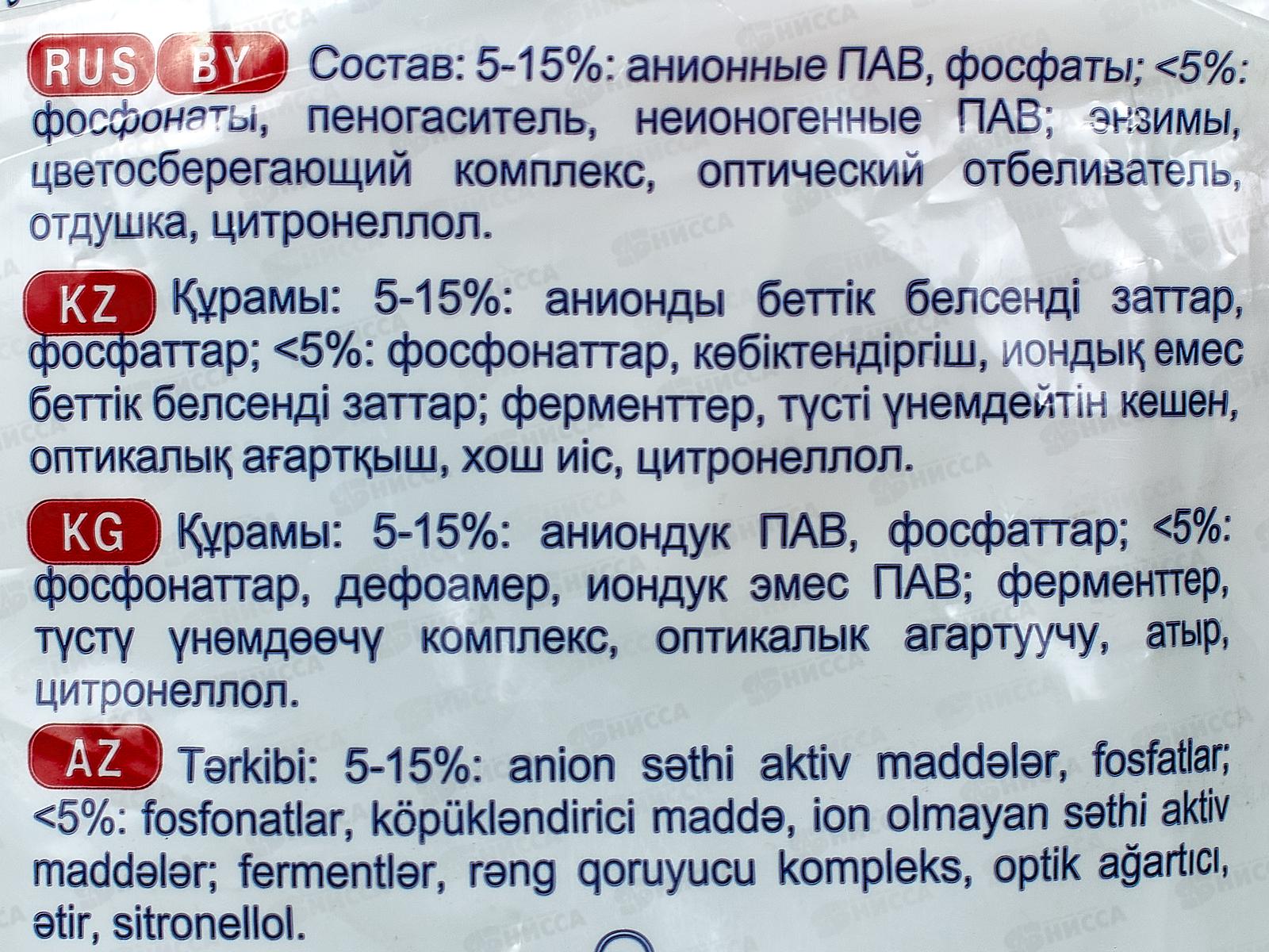 Состав: анионные поверхностно-активные вещества (5–15%), фосфаты (5–15%), фосфонаты (<5%), пеногаситель (<5%), неионогенные ПАВ (<5%), энзимы, цветосберегающий комплекс, оптический отбеливатель, ароматизатор (отдушка), цитронеллол.